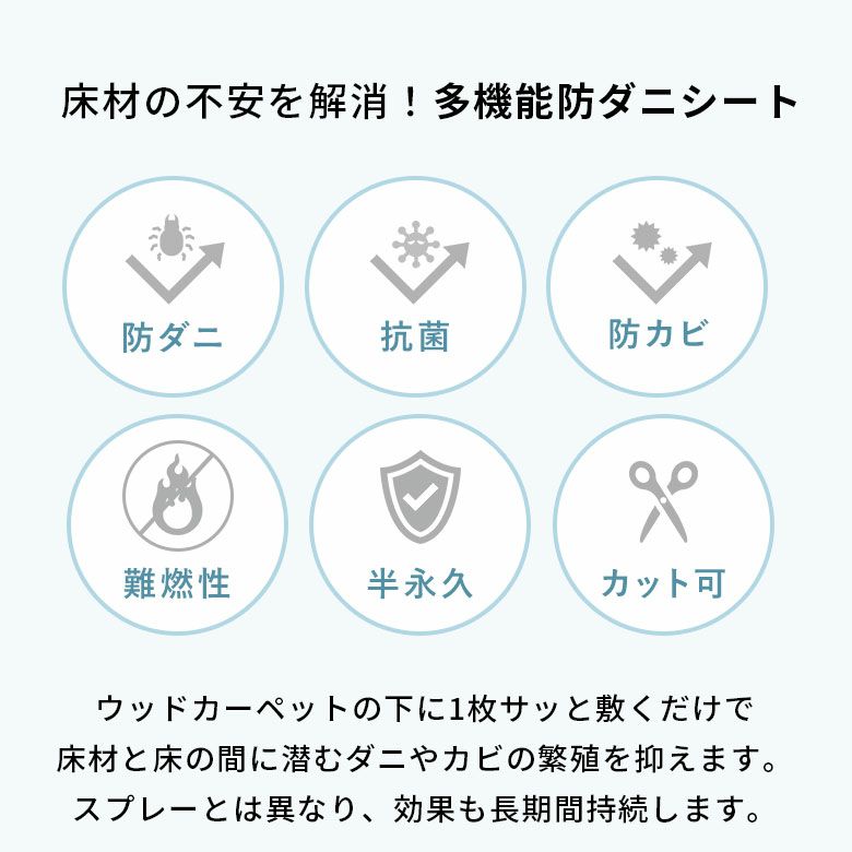敷くだけで部屋を簡単にリフォームできるウッドカーペットは、長期間敷きっぱなしになることも多いもの。こんな不安がある方も少なくありません。そんな不安を“敷く前に”解消できるのが、この防ダニシートです。