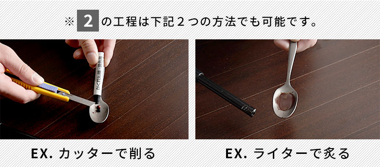 かくれん棒をドライヤーをあてながら傷と直角に刷り込みます。 |