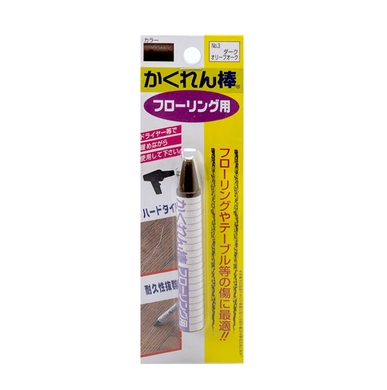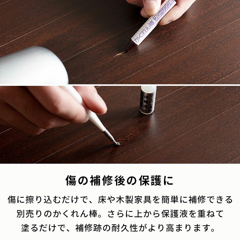 ウッドカーペットや木製家具のスキマ・傷補修に使える、高密度ワックス系補修材「かくれん棒」の保護液。上から保護液を塗ることで、補修跡の表面保護にも役立ちます。