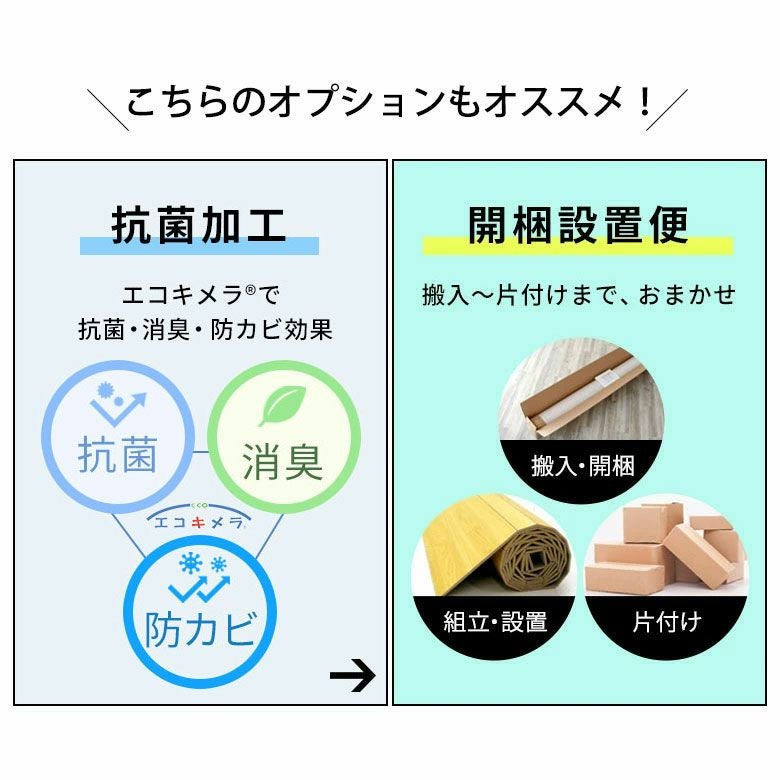 ウッドカーペットの表面に、抗菌・消臭・防カビ・防汚効果を追加できるオプションサービスあり。