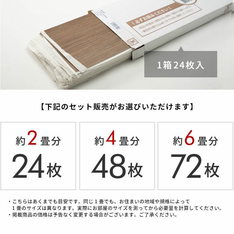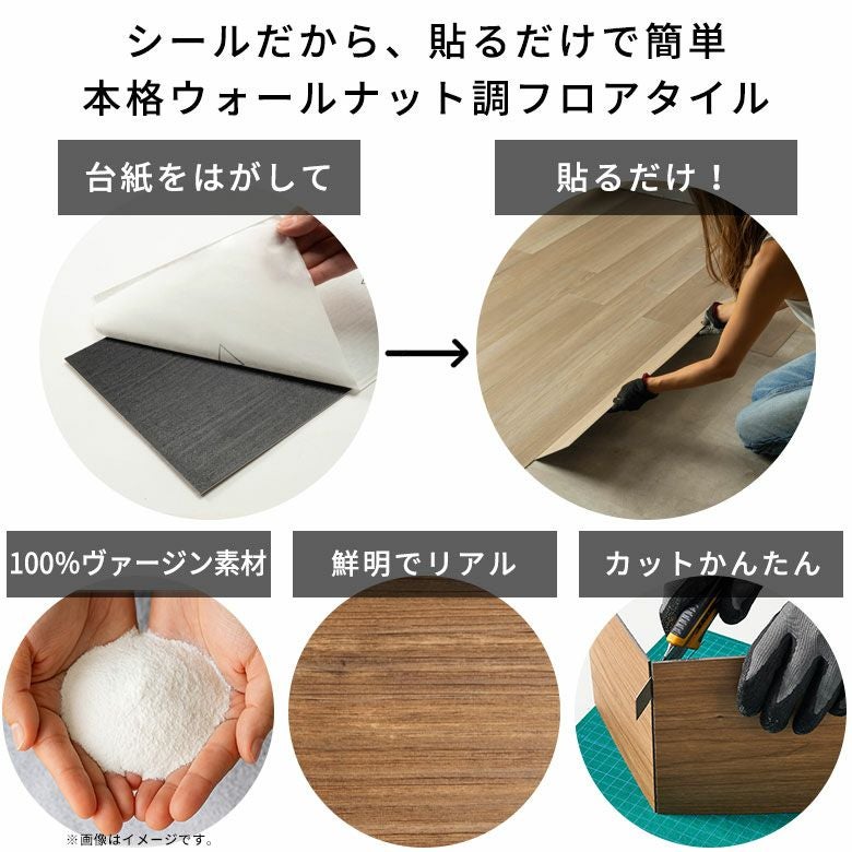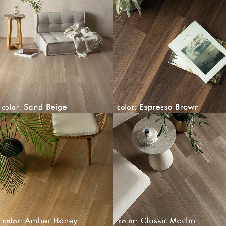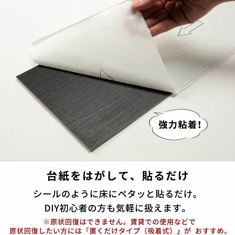 こちらは、あらかじめ接着剤の付いた、台紙をはがしてペタっと床に貼るだけのシール式。厚みは1.2mm、薄くて軽い仕様なので女性でもラクに施工できます。ノコギリや接着剤などの特殊な道具は不要なので、初めての方でも安心です。コストを抑えて本格DIYを叶える、お手頃価格も嬉しいポイントです。