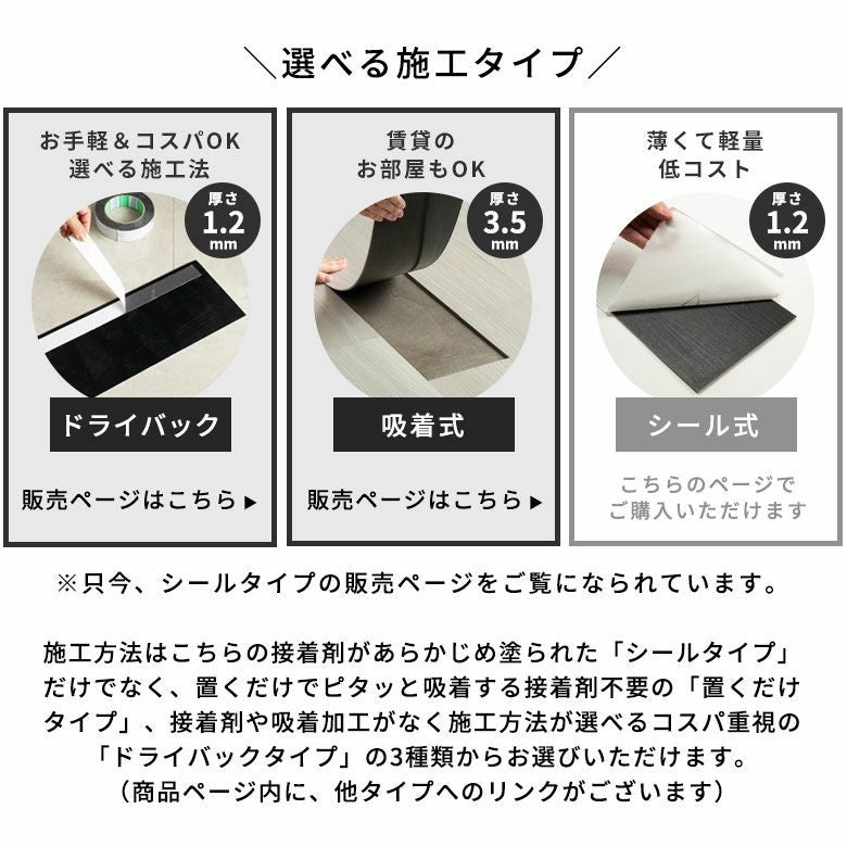 施工方法はこちらの接着剤があらかじめ塗られた「シールタイプ」だけでなく、置くだけでピタッと吸着する接着剤不要の「置くだけタイプ」、接着剤や吸着加工がなく施工方法が選べるコスパ重視の「ドライバックタイプ」の3種類からお選びいただけます。