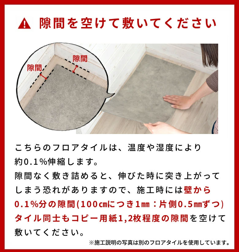 ・表面は多少水をはじきますが、タイルのつなぎ目部分は水が染み込みますので、水などをこぼされた場合はすぐに拭き取ってください。
