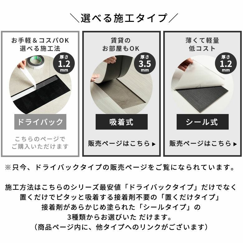 ・置くだけ、シール、ドライバックの3種類からお住い、ご使用の条件にあった施工方法が