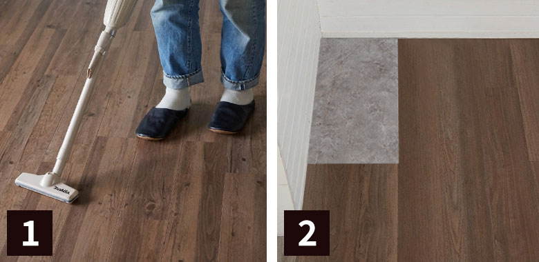 フロアタイルを貼りたい床面の油脂やホコリを掃除します。 |