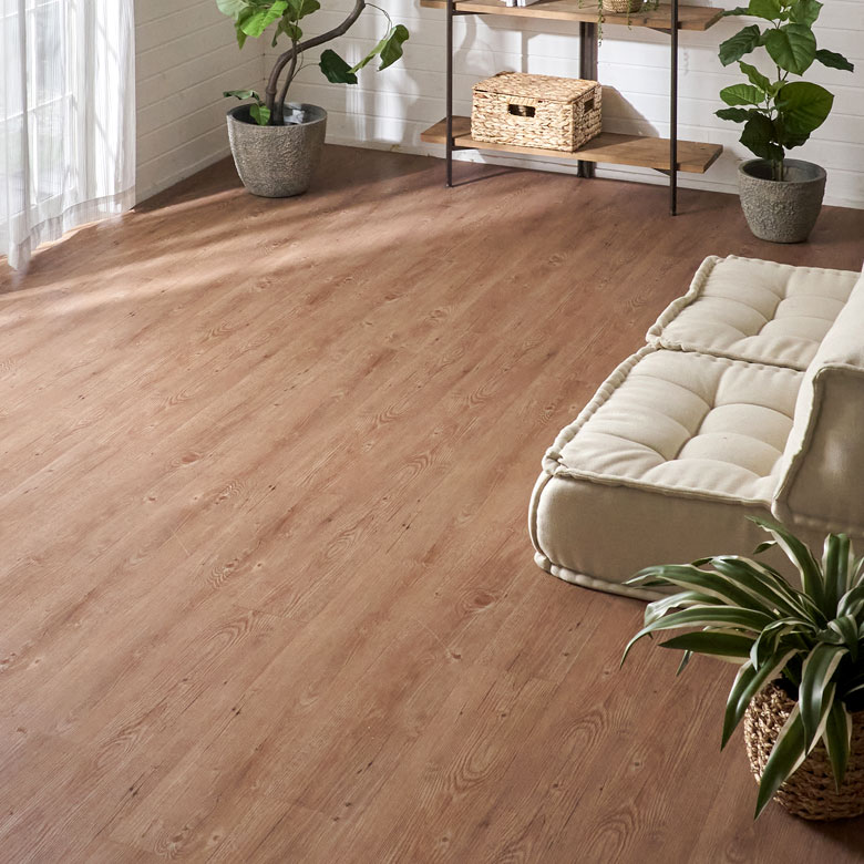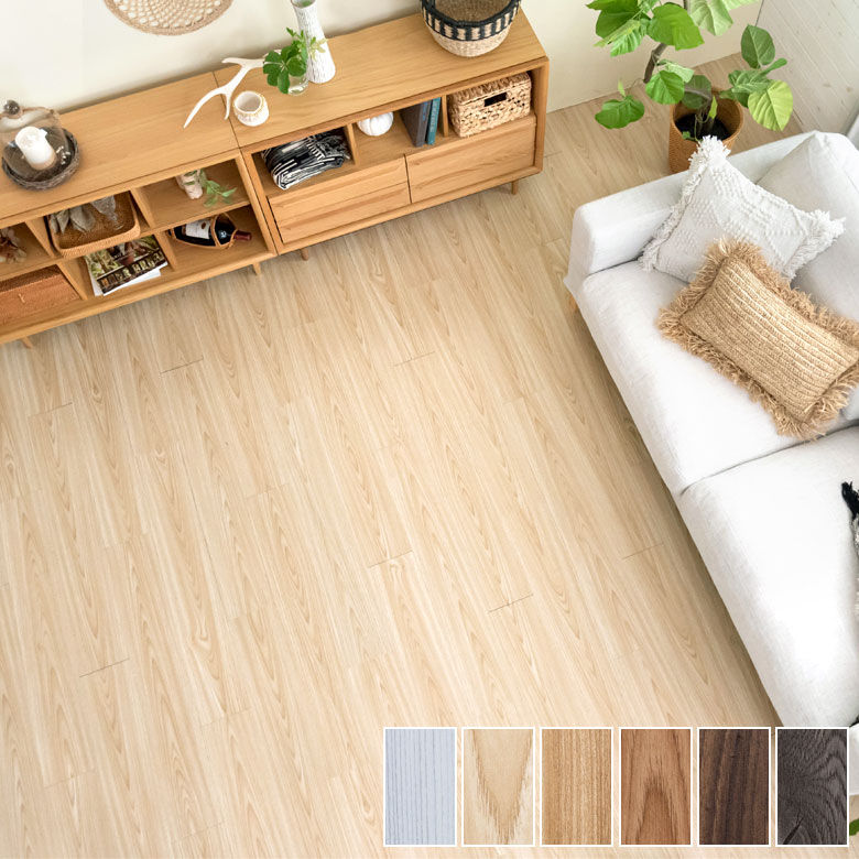 グラスファイバー入りで、季節や環境によるフロアタイルの伸縮を軽減。 接着材不要なため、賃貸でも使えて再利用も可能。