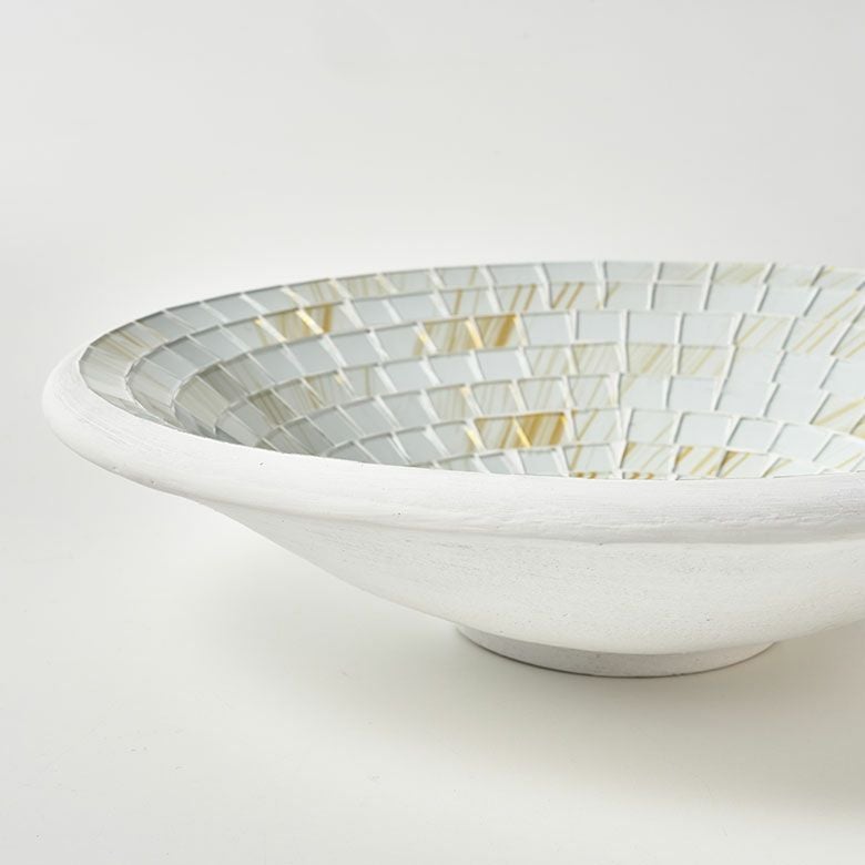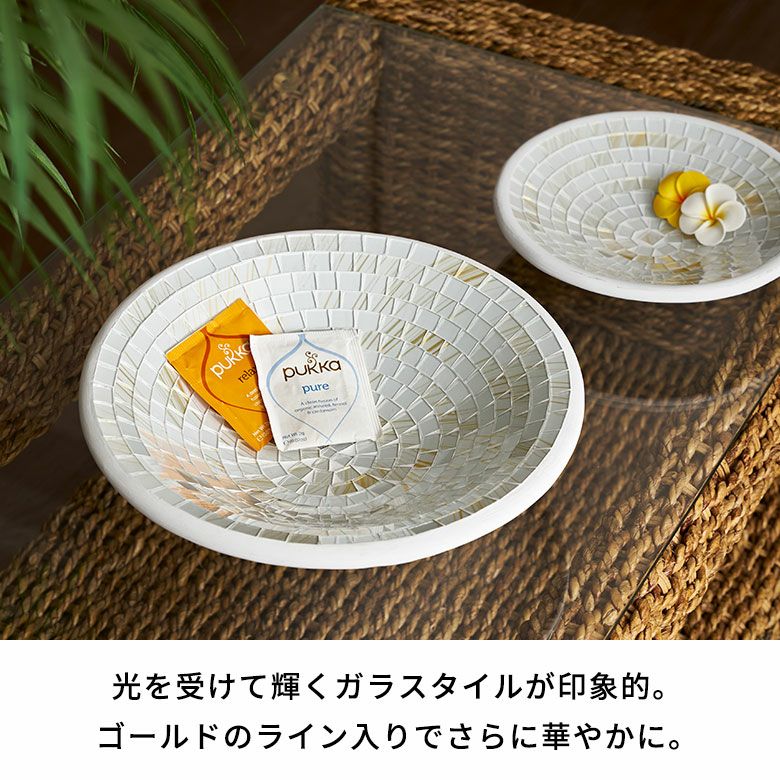 爽やかなホワイトのカラーリングのアジアンプレート。表面に四角形のガラスをバリ島の職人がひとつひとつ丁寧に貼り合わせた、モザイクガラスが特徴的な美しいアイテムです。