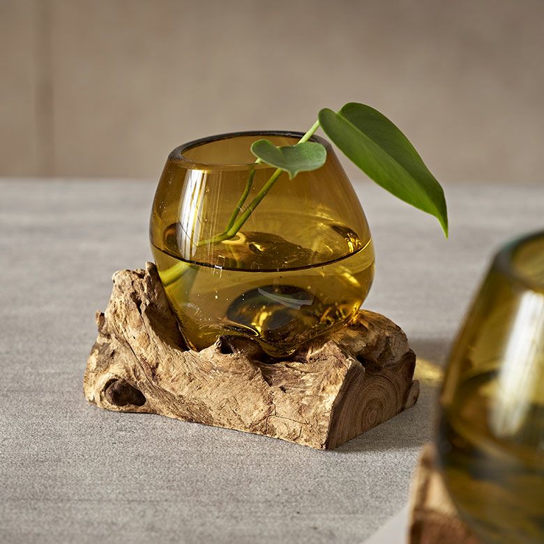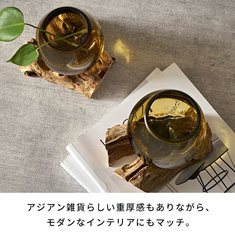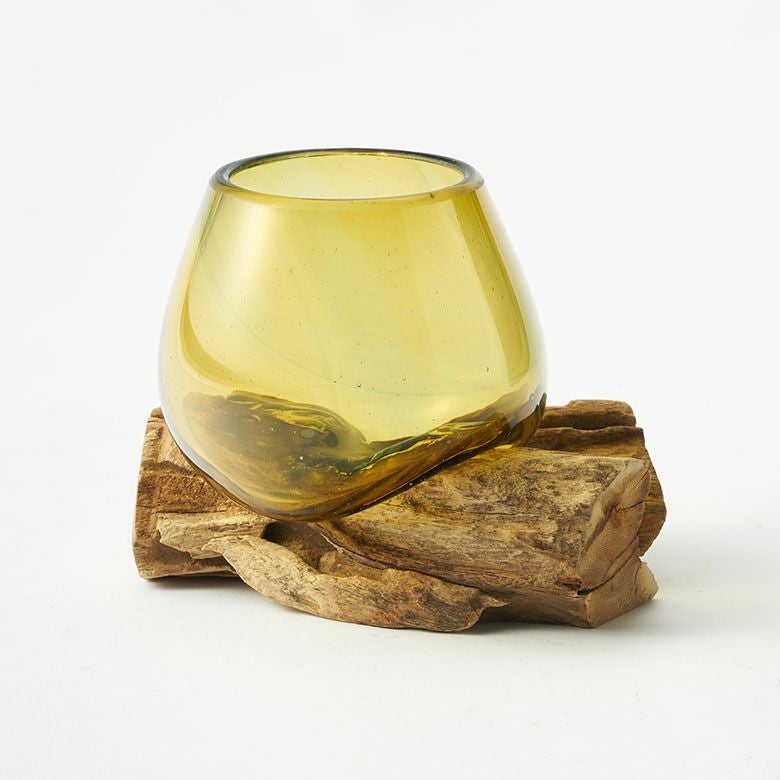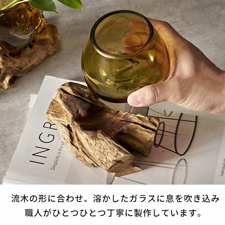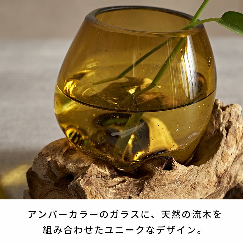 ぽってりとしたアンバーカラーのガラスに、天然の流木を組み合わせた