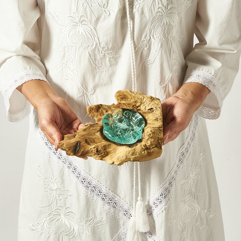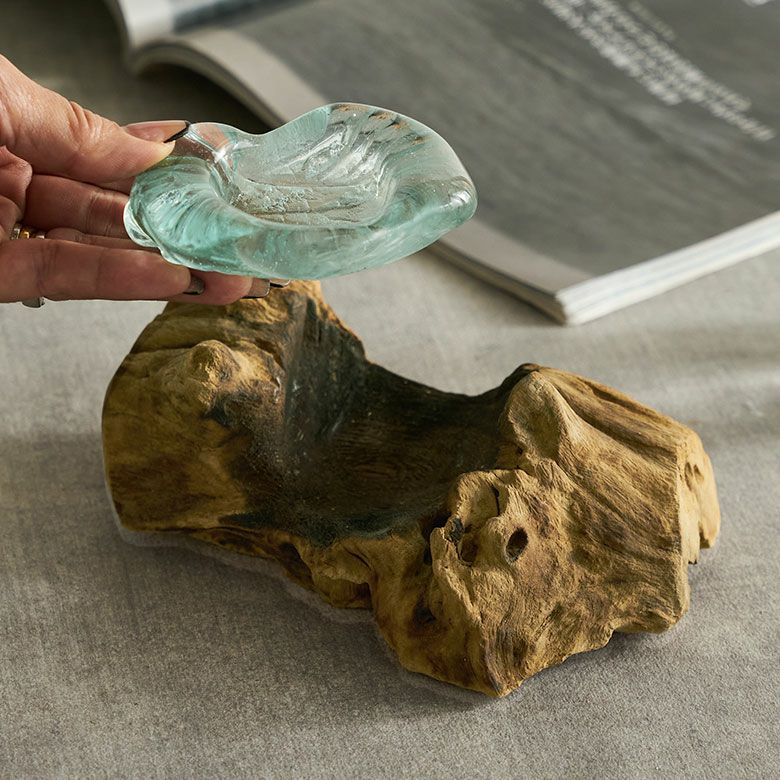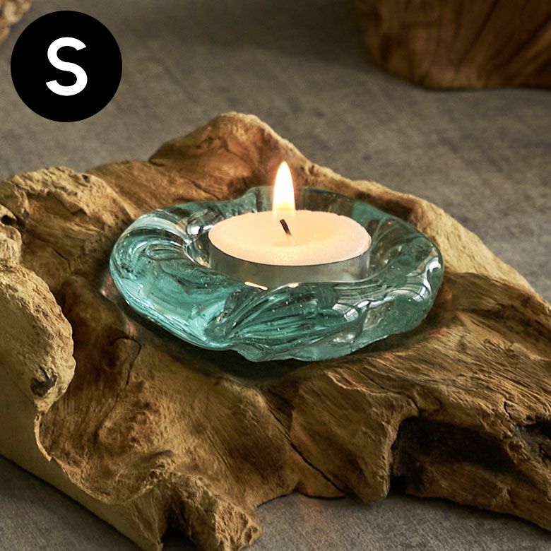 古木の自然な造形と職人の技が織りなす、古木×リサイクルガラスのキャンドルホルダー。