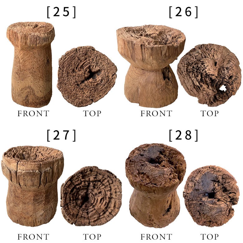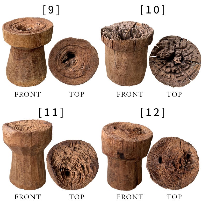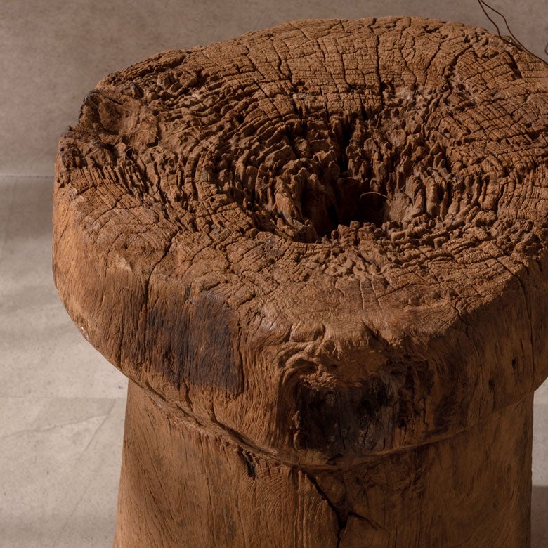 かつてインドネシアの農村で穀物を挽くために使われていた、チーク無垢材の古い臼。その役目を終えた木材を自然の中に戻し、さらに土壌で1~2年かけて朽ちさせることで、独特のラスティックな風合いを引き出したアップサイクルの木製オブジェです。