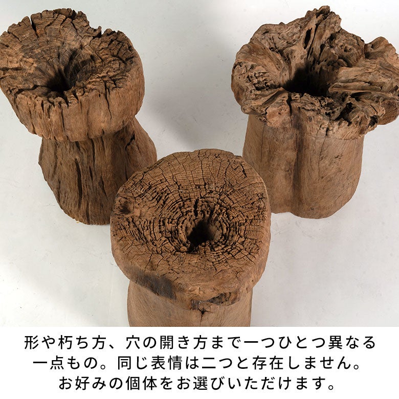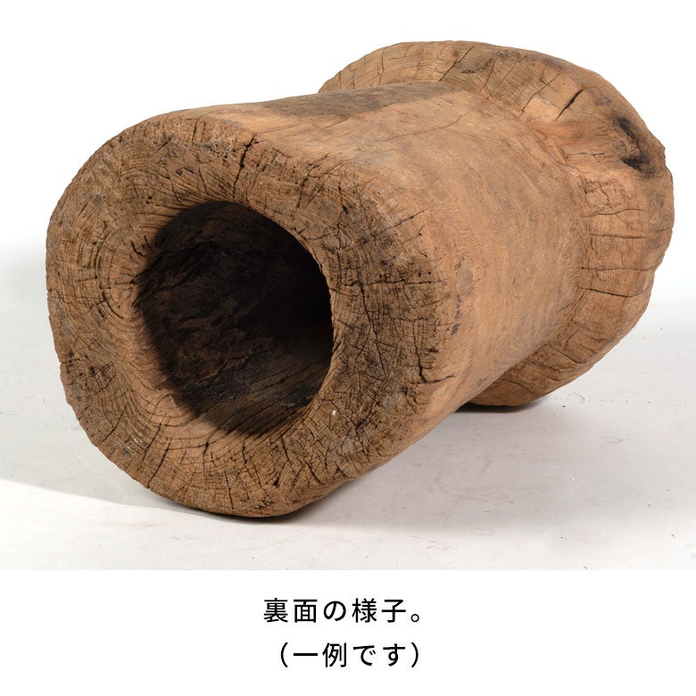 元の臼をひっくり返して仕立てているため内部は大きく空洞になっており、個体によっては穴が貫通しているものもあります。直径約32~51cm、高さ約44~57cmと個体差のある大型サイズは、置くだけで空間の印象を変えるボリューム。リビングや玄関はもちろん、店舗やホテル空間のアートピースとしても映えます。