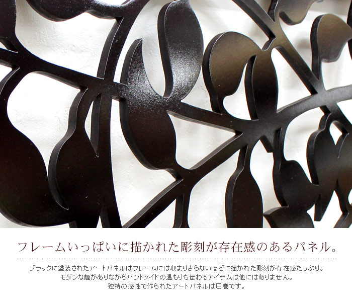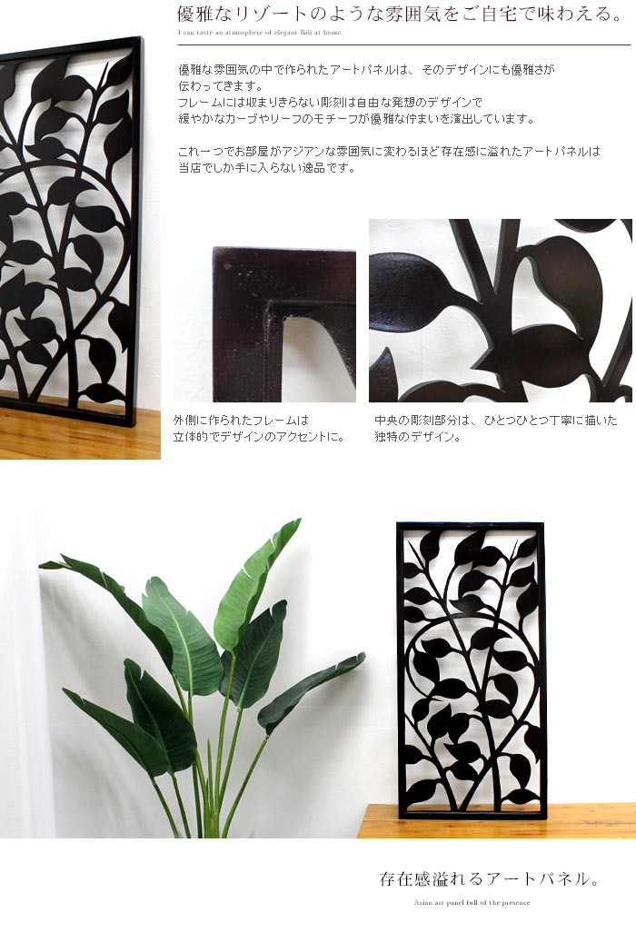 | バリ島の職人がハンドメイドで作ったアートパネルはバリ島の自然の中に生っているリーフをモチーフにして描かれています。 ブラックのカラーリングがモダンで趣のあるアイテムでアジアンはもちろんモダンなインテリアにもマッチします。 バリのレストランなどでも使われることの多いアートパネルですので、これひとつでご自宅でバリ島の雰囲気を楽しむことができます。 サイズも大きく存在感のあるインテリアとして楽しめます。 | |||||