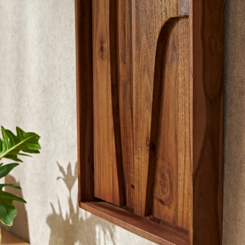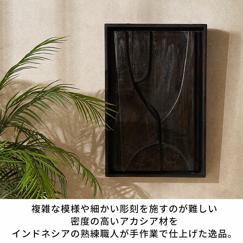 無垢のアカシアウッドを使用した、重量感ある佇まいの 3Dウッドウォールアート。複雑な模様や細かい彫刻を施すのが難しい密度の高いアカシア無垢材を、インドネシアの熟練職人がひとつひとつ手作業で仕上げた逸品です。形の違うウッドピースを丁寧に組み合わせた、立体的でトレンド感あるアブストラクトデザインが、ワンランク上のホテルライクな雰囲気を演出します。光の角度で、表情が変わる美しい陰影をお楽しみください。
