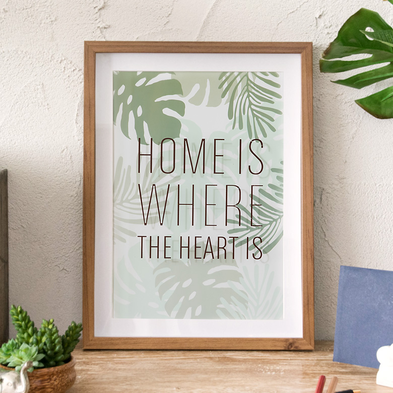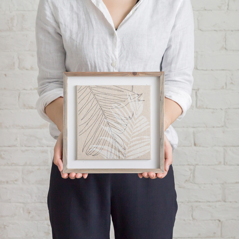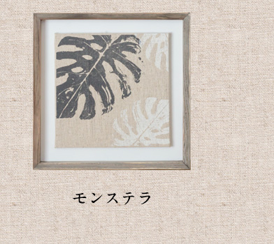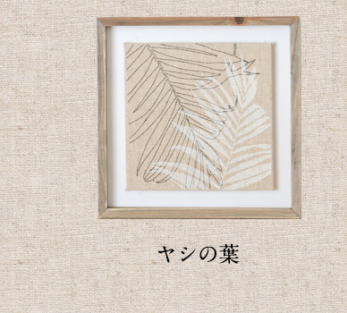 ナチュラルなリネン生地に、ヤシの葉のイラストをプリントしたアートフレーム。