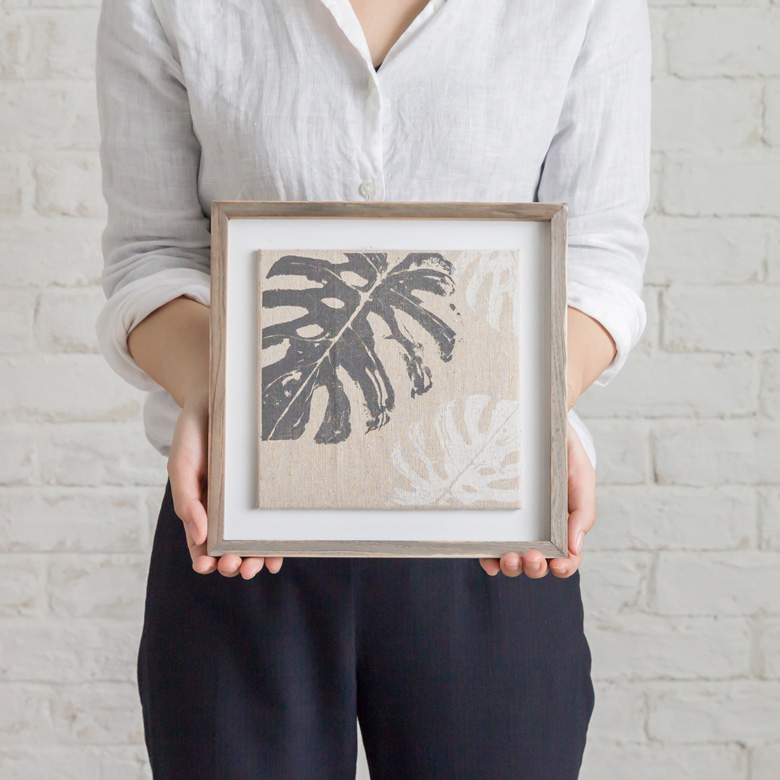 ナチュラルなリネン生地に、モンステラのイラストをプリントしたアートフレーム。