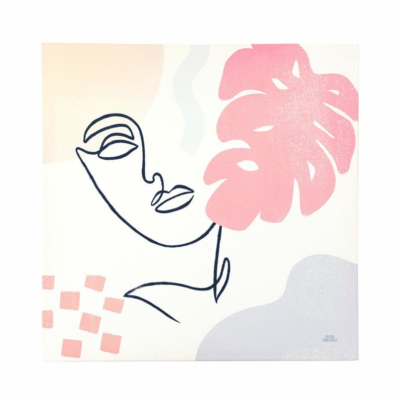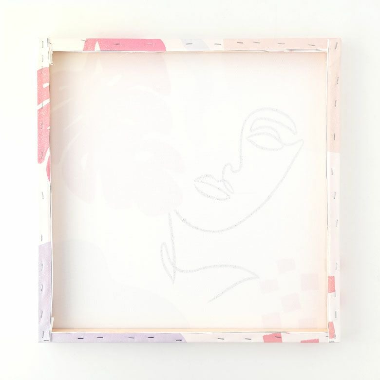 ピンクをベースとした配色の中に、描かれた女性の横顔は