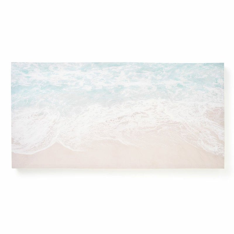 砂浜に打ち寄せる波を描き、爽やかな海岸の雰囲気を醸し出しています。