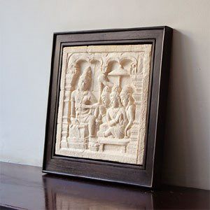 手間暇かけて作り上げたストーンレリーフは、ブッダを3人が崇め