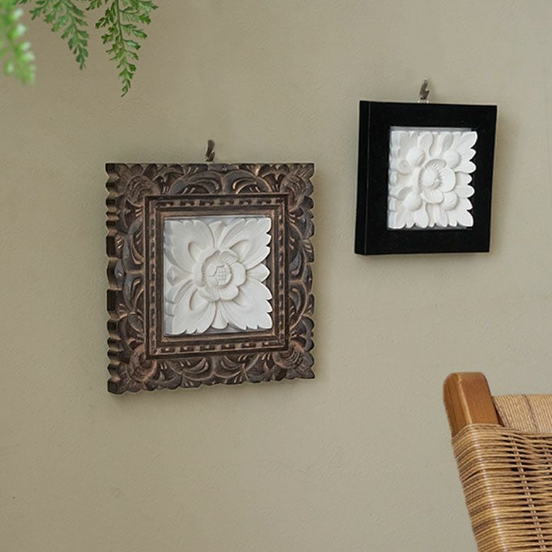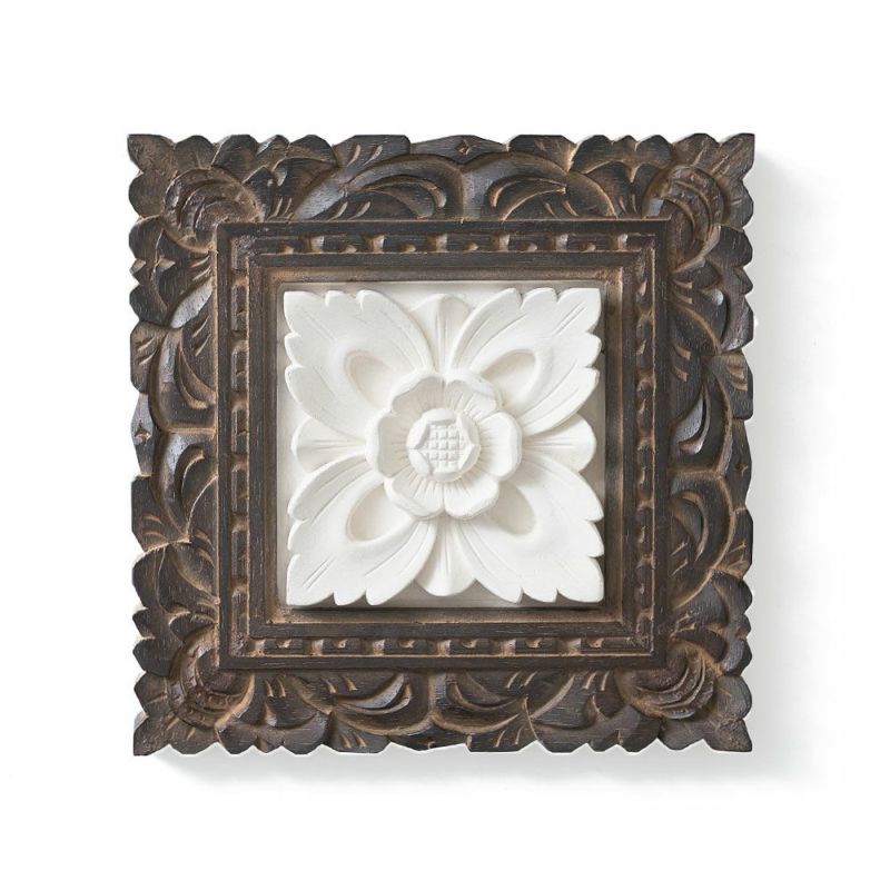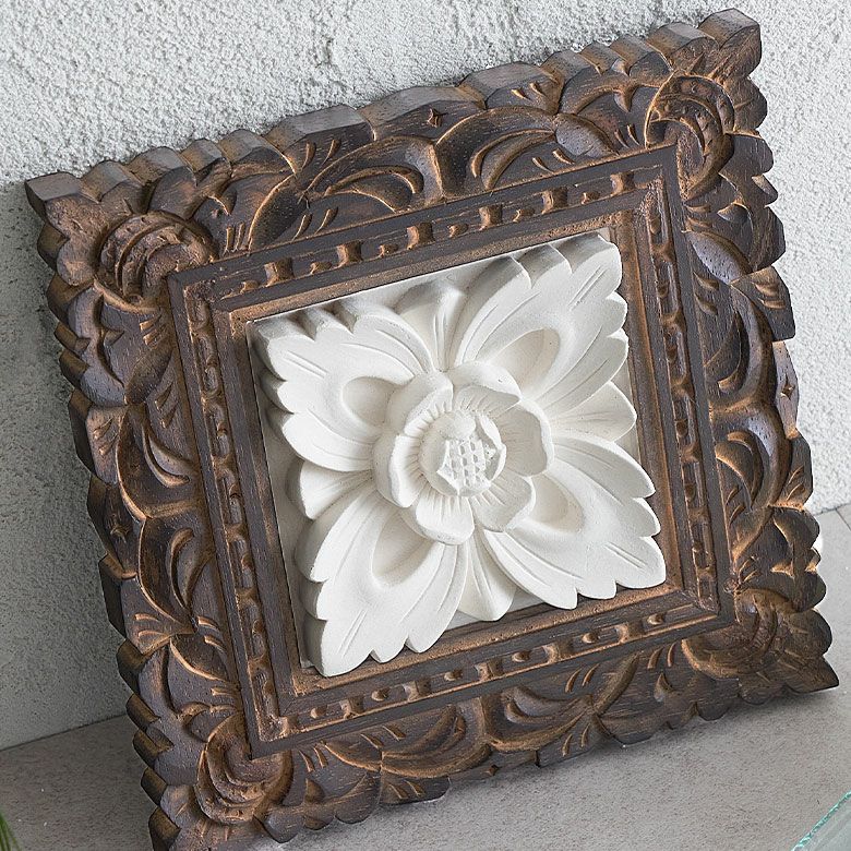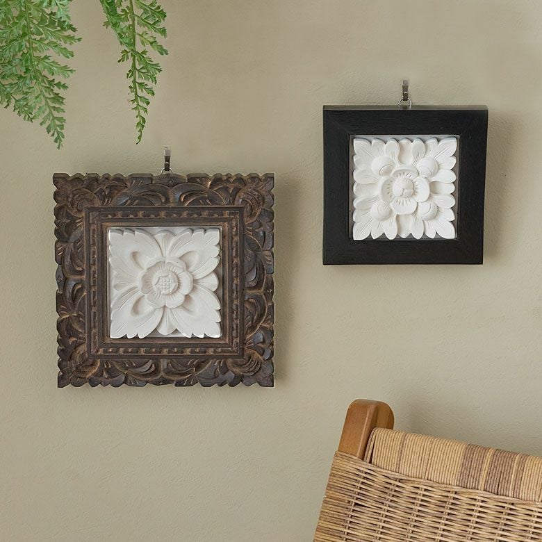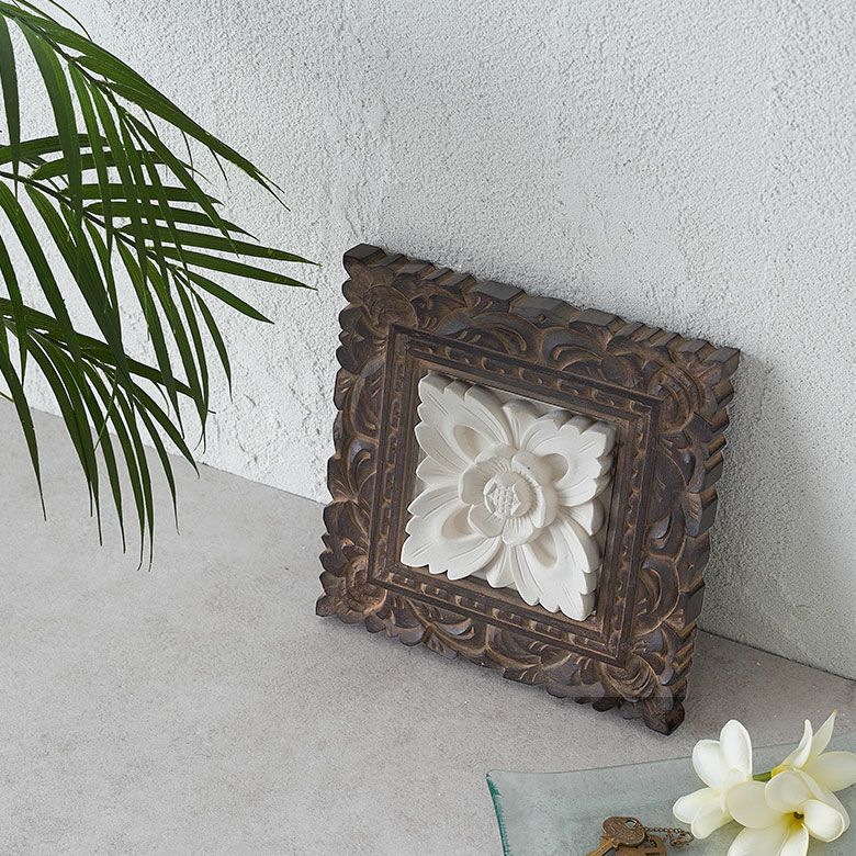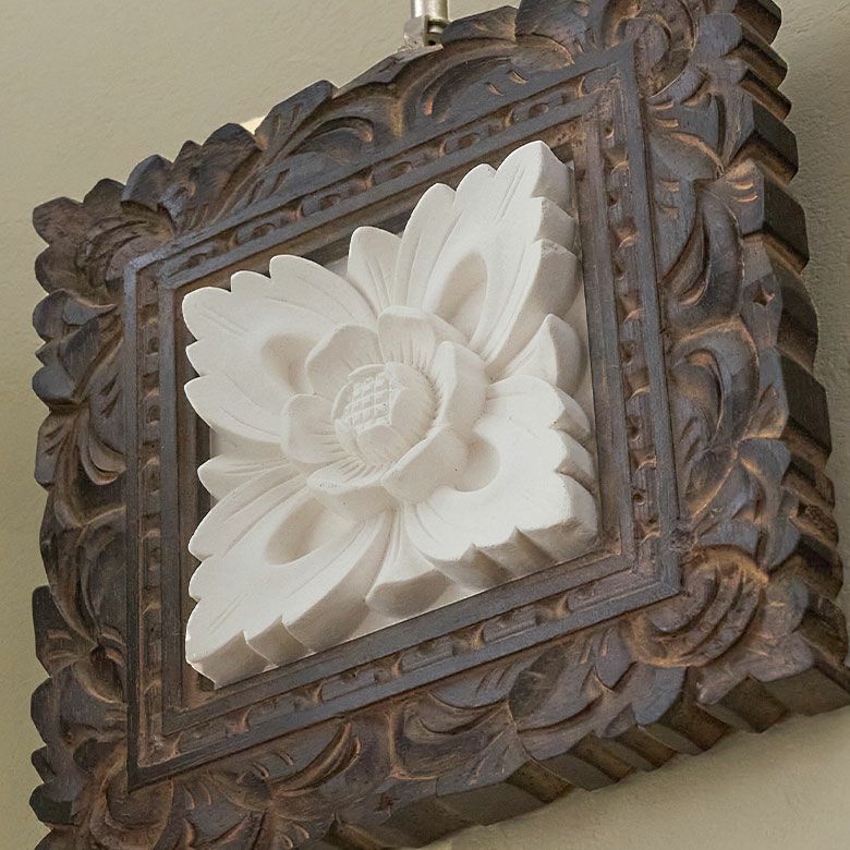 バリの職人が作り上げた、木製フレームを組み合わせたストーンレリーフ。
