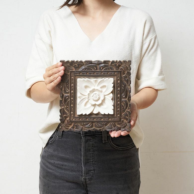 木の温もりが感じられる木製フレームは、バリの職人の手彫り。