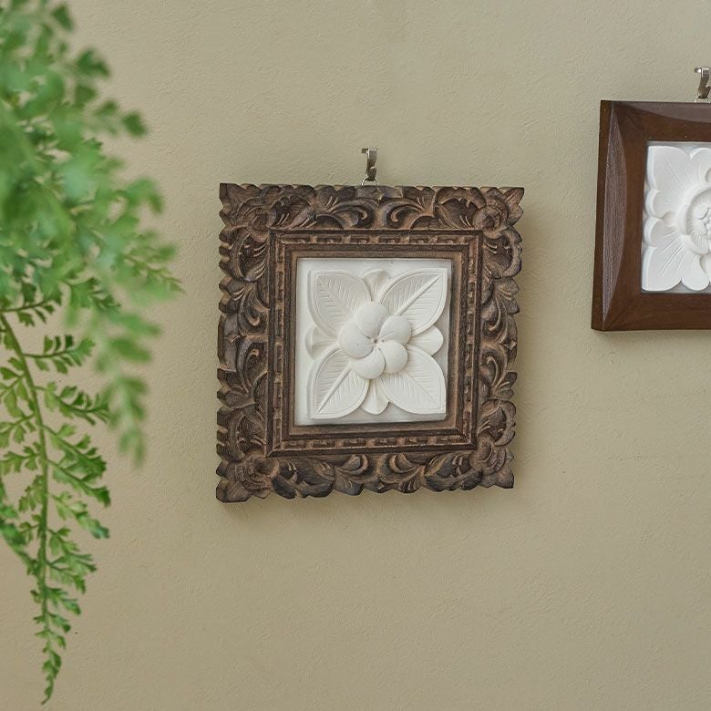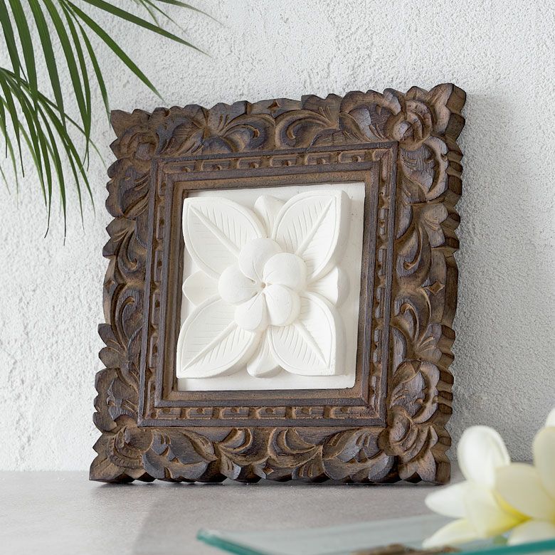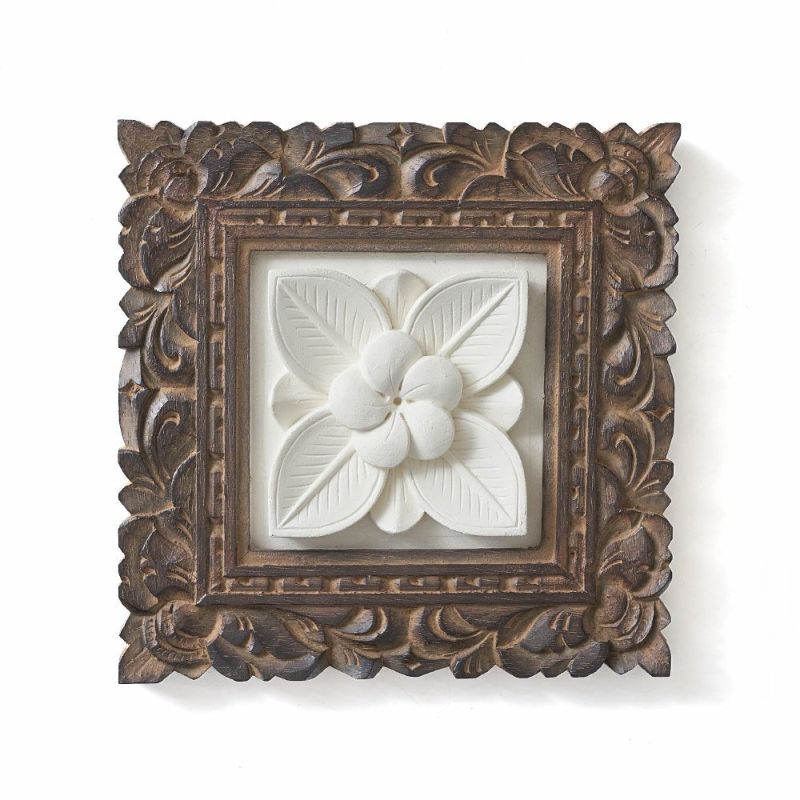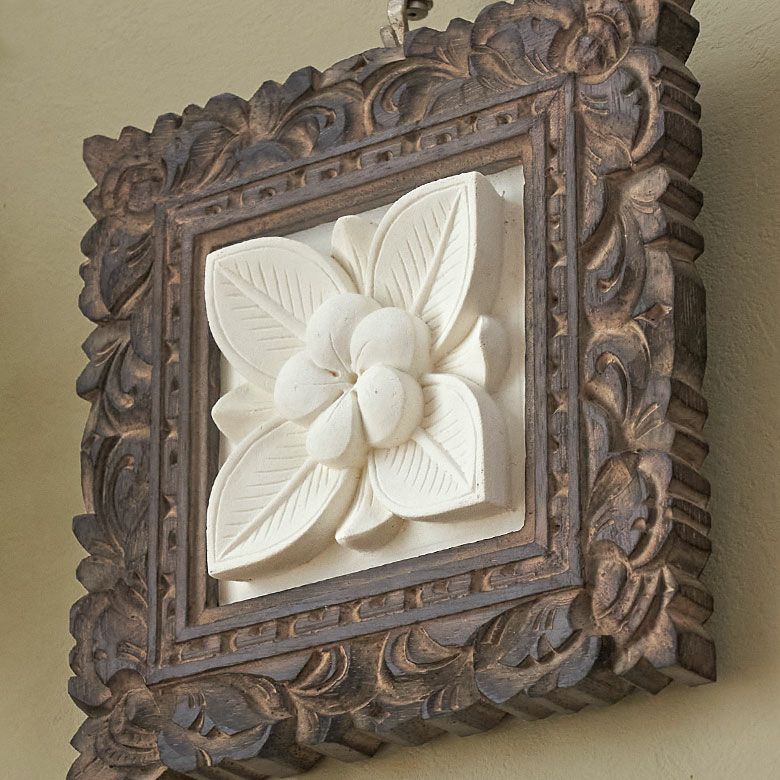 バリの職人が作り上げる、木製フレームを組み合わせたストーンレリーフ。