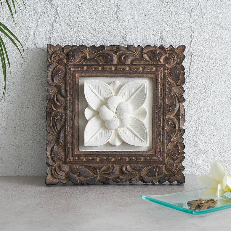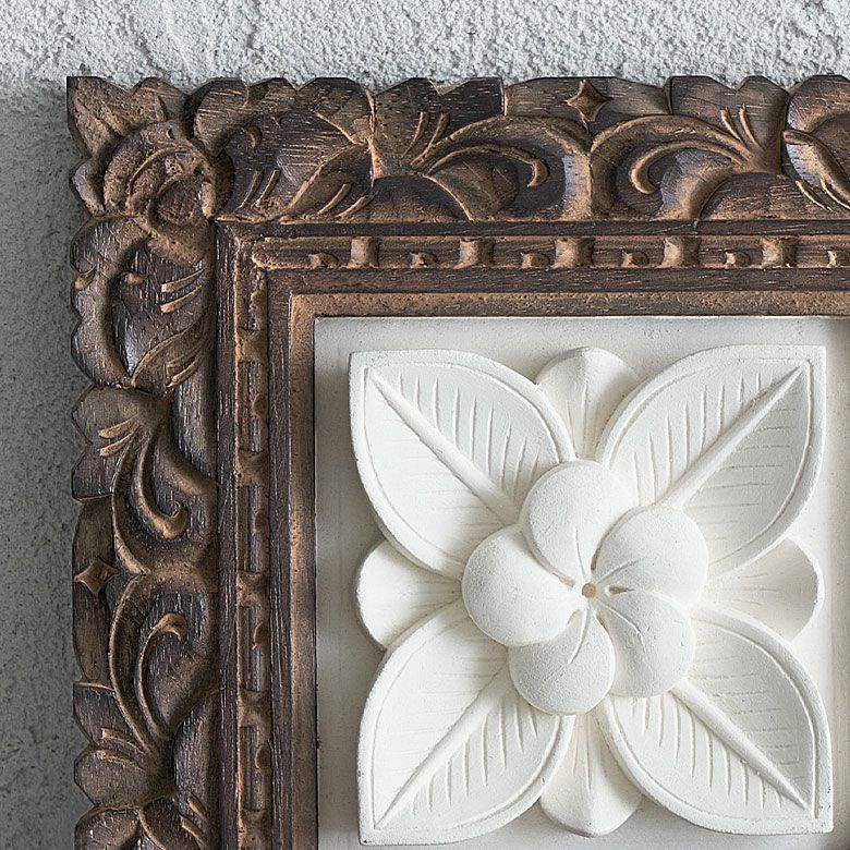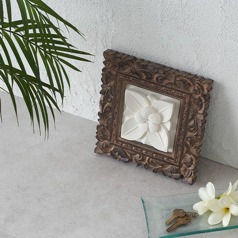 木の温もりが感じられる木製フレームは、バリの職人が手彫りで仕上げたもの。
