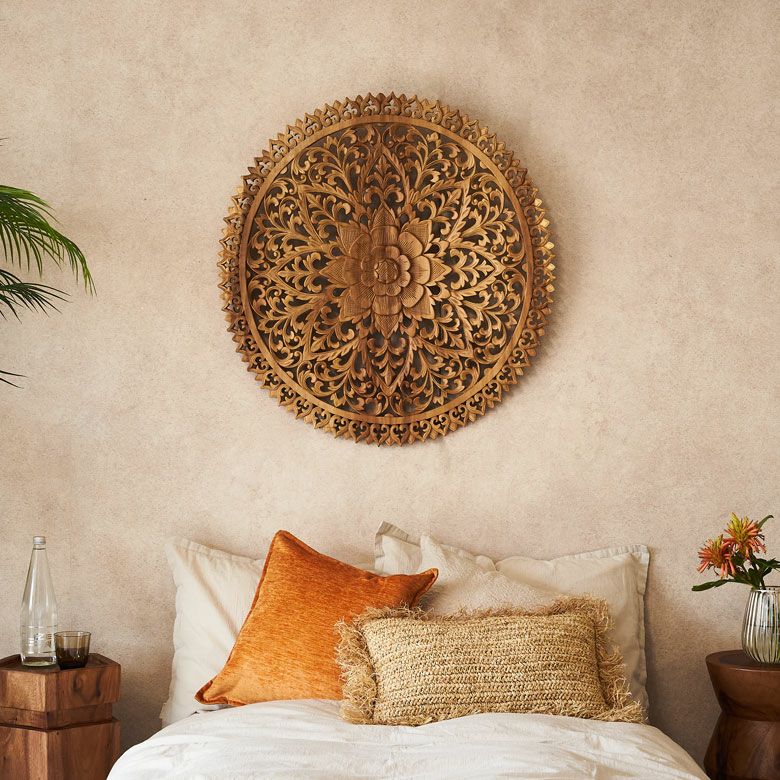 スクエアと同じ神聖な花のモチーフを中心に、円形のデザインで永遠・調和・スピリチュアルな完全性を象徴。装飾には“結界”の意味もあり、空間を守る神聖な力を表現。