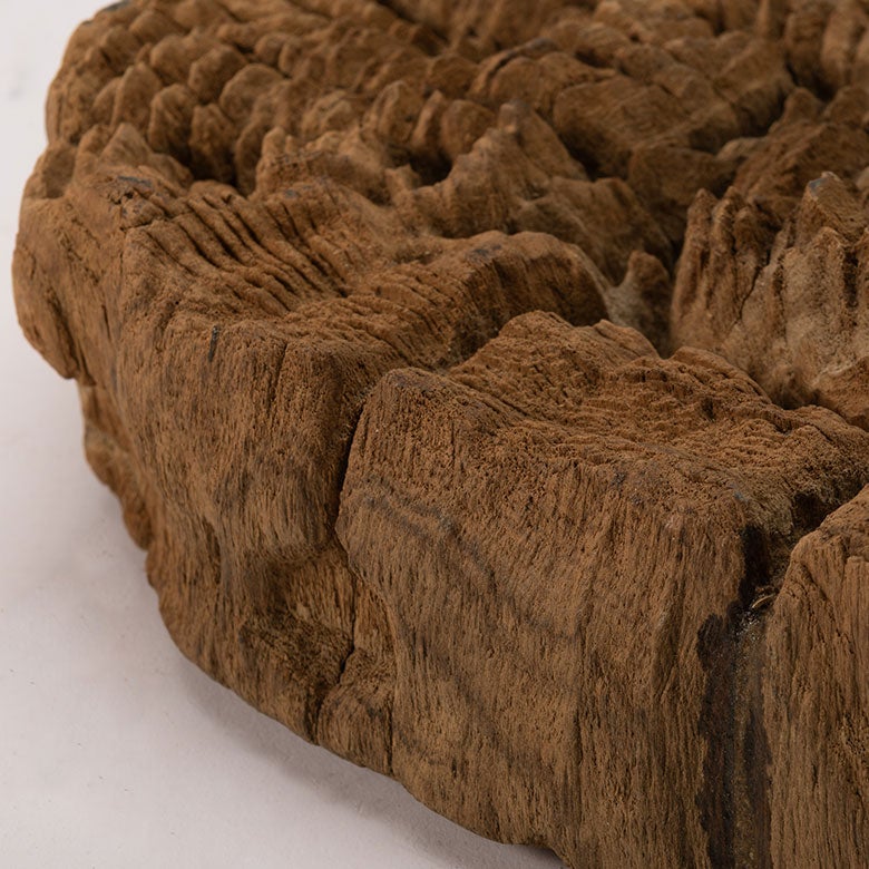 かつてインドネシアの農村で穀物を挽くために使われていた、チーク無垢材の古い臼。その役目を終えた木材を自然の中に戻し、さらに土壌で1~2年かけて朽ちさせた後、臼の上部のみを切り出して仕上げることで、独特のラスティックな風合いを引き出したアップサイクルの木製オブジェです。