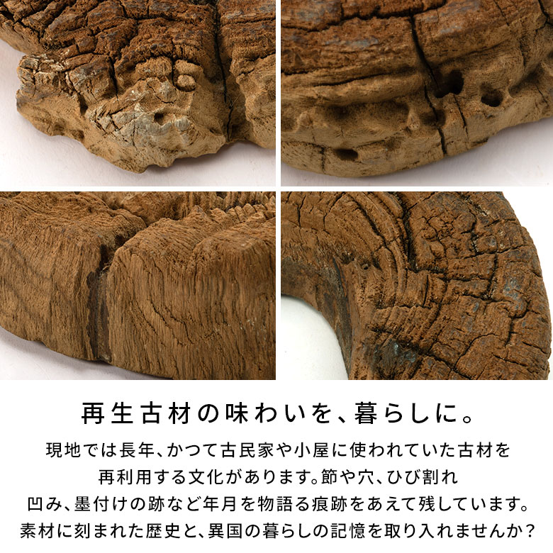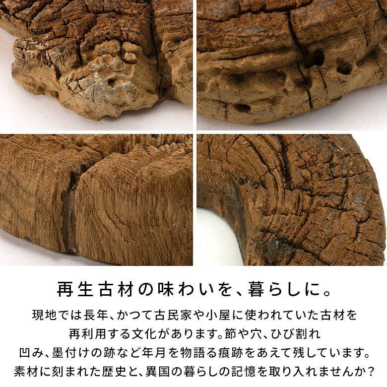 チーク古材の素朴な風合いが畳や木部と調和し、壁掛け・平置きのどちらでも楽しめるアートオブジェとして和の空間に自然なアクセントを添えます。