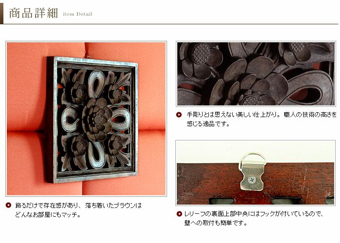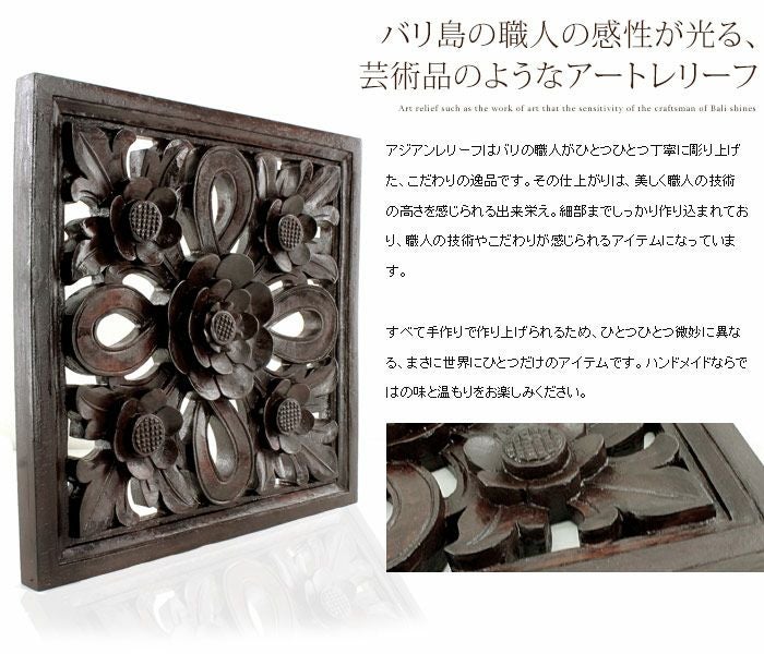 アジアンレリーフはバリの職人がひとつひとつ丁寧に彫り上げた、こだわりの逸品です。その仕上がりは、美しく職人の技術の高さを感じられる出来栄え。