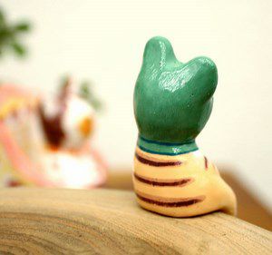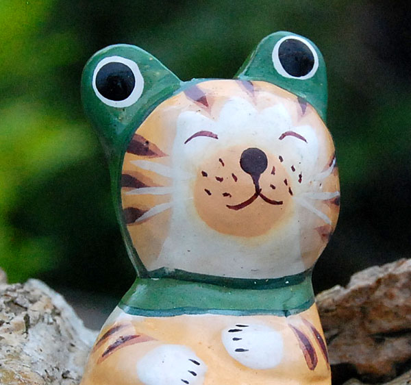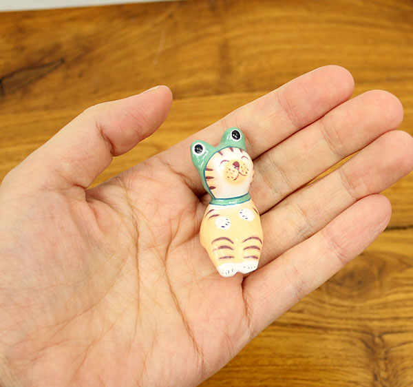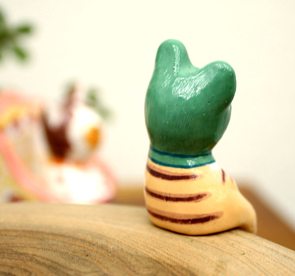 人気の動物オブジェに、カエルのかぶり物をかぶった愛情のある表情が