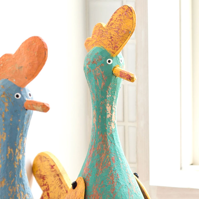 一つ一つ職人によって木を彫って作られたニワトリのオブジェは、