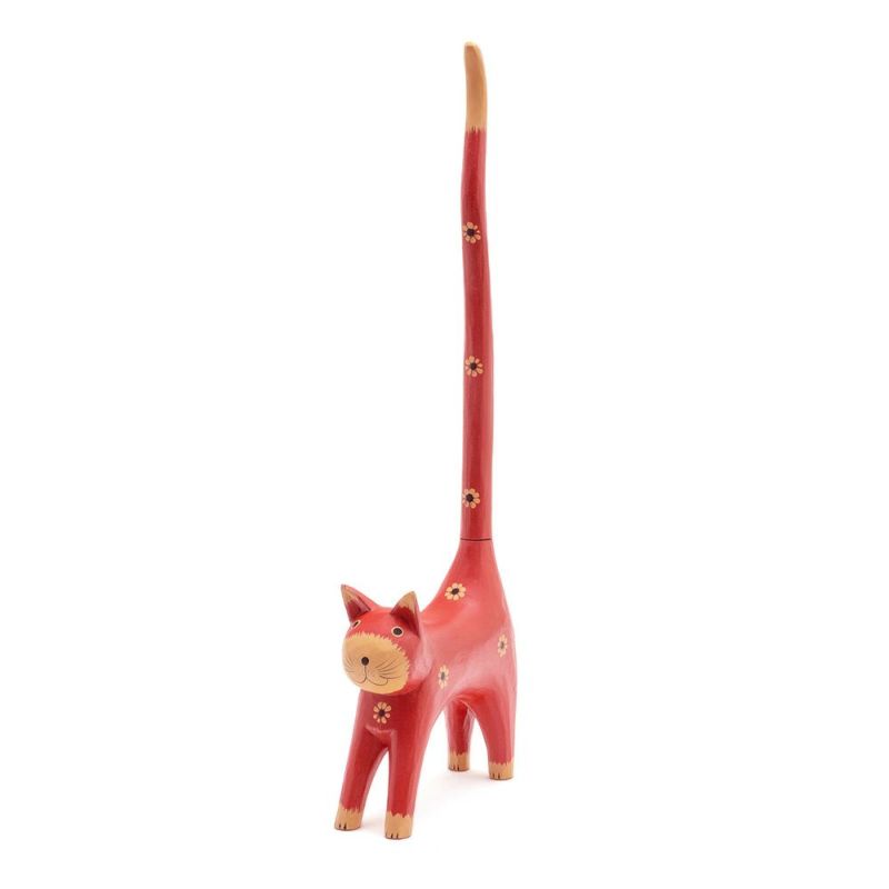 しっぽでトイレットペーパーを持ってくれる木彫りのネコのオブジェ。