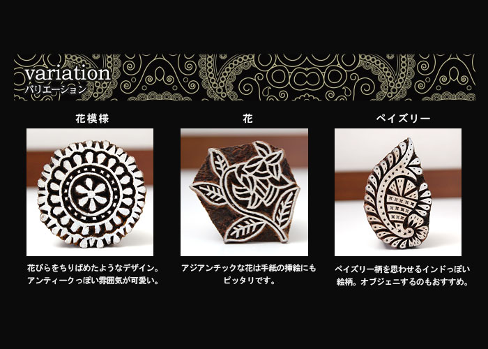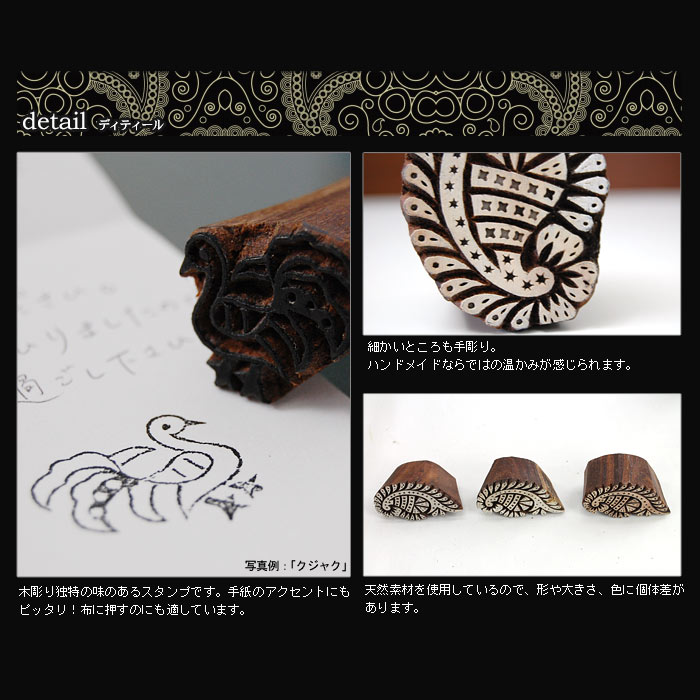 味のある手作り感たっぷりの手彫りスタンプ。インドの職人達によってひとつひとつ |