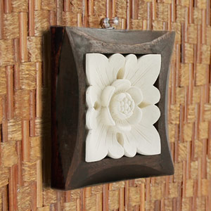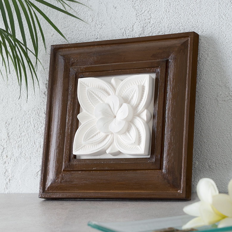 バリの職人が作り上げる、木製フレームを組み合わせたストーンレリーフ。