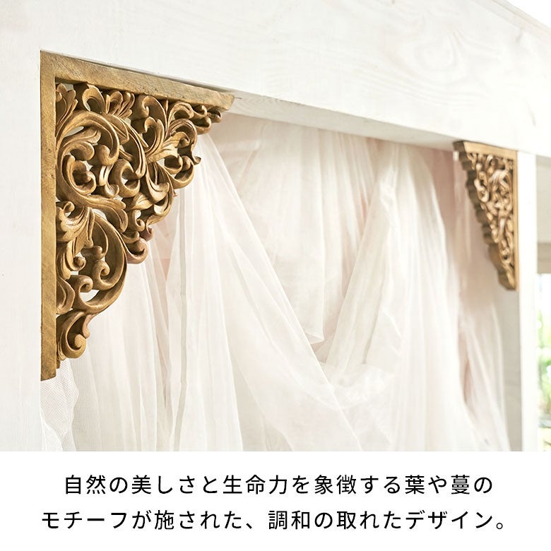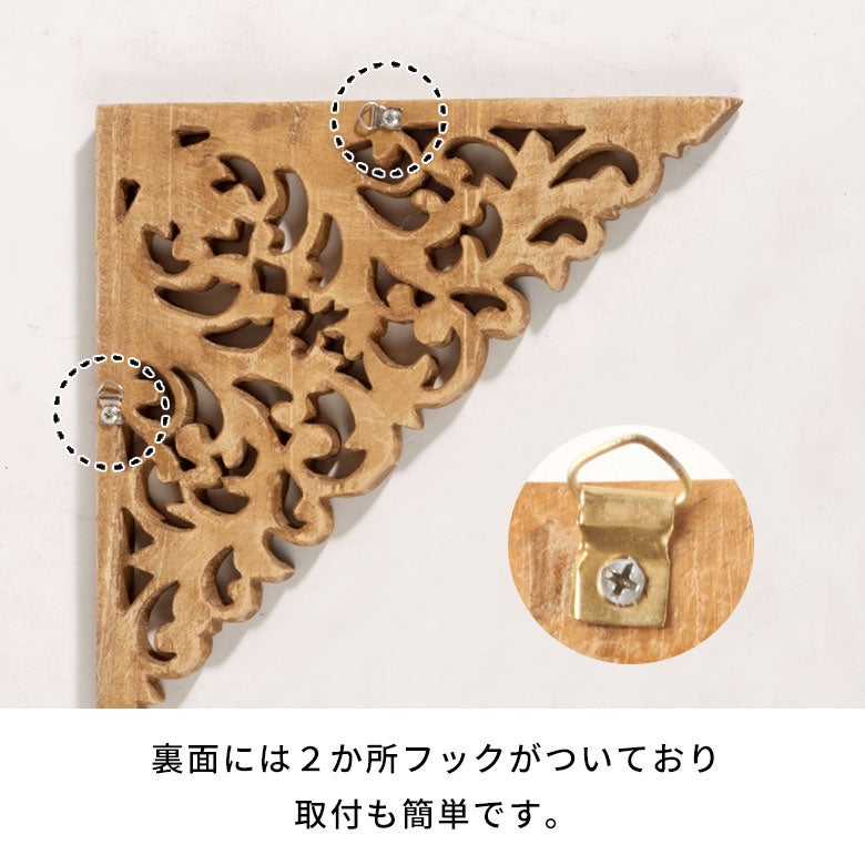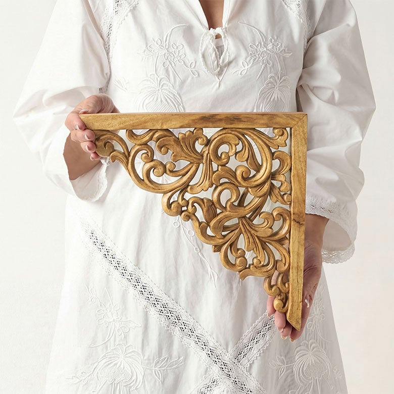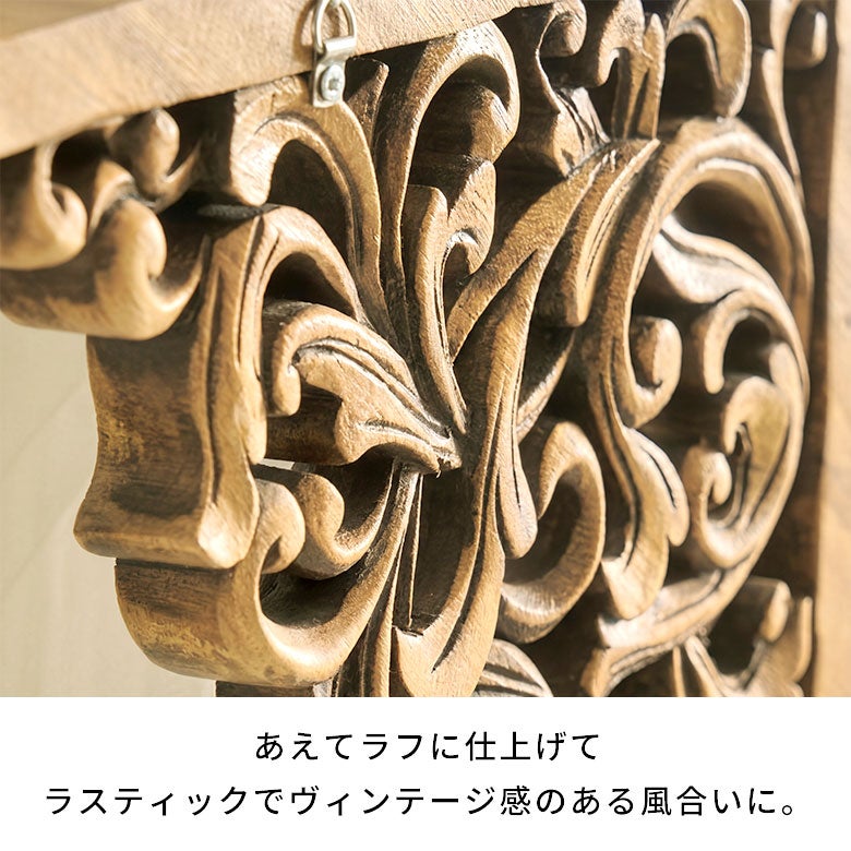 インドネシアの熟練職人がひとつひとつ丁寧に手彫りで仕上げた、オールハンドメイドのコーナーレリーフ。 自然の美しさと生命力を象徴する葉や蔓のモチーフが施され、調和の取れたデザインが特徴です。 木の表情を残した素朴な風合いと、手仕事ならではの温もりを感じられるラスティックな仕上がりです。
