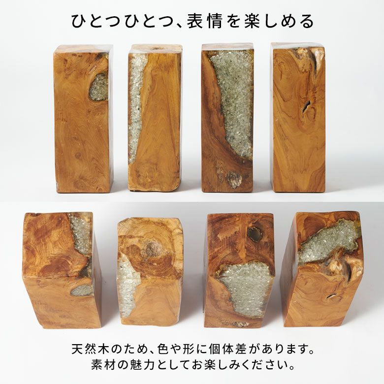 ・味わい深い古木のチーク材の節や欠け部分にクラッシュガラスを流し込んだ、個性的なオブジェ