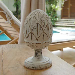 ドラゴンフルーツってご存知ですか? ピタヤとも呼ばれるサボテン科の果実で、割ると白いクリーム状の果肉にゴマのような黒い種子が散らばったような、バリ島もよく目にするアジアンフルーツです。 そんなドラゴンフルーツをモチーフにしてアジアンインテリアのアクセントになるオブジェを作っちゃいました! ポイントはアンティーク感を出したホワイトウォッシュカラー。木彫りのオブジェに白い塗装を施し、乾燥する前に軽く拭きあげることでアジアンテイストの中にモダンなテイストをプラスしました。 殺風景な場所にこのオブジェを置くだけで、いい雰囲気になりますよ♪