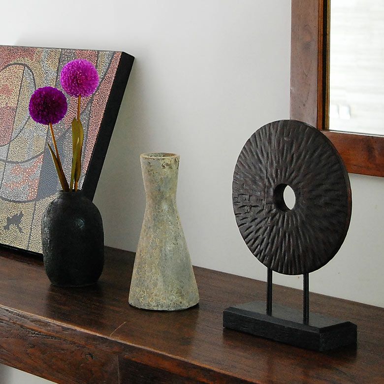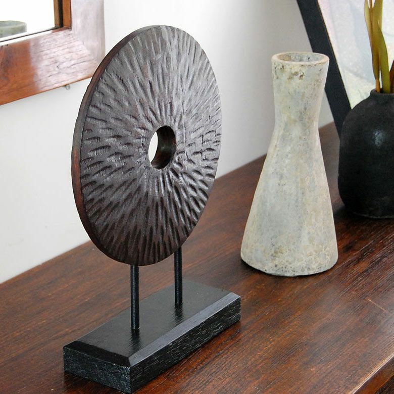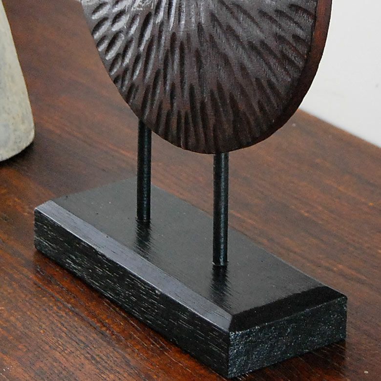 ダークブラウンの落ち着いた色合いや、木が持つアンティーク調の質感がシンプルなデザインのオブジェに重厚感をプラスしています。