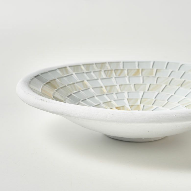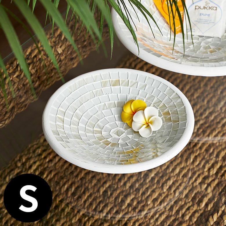 爽やかなホワイトのカラーリングのアジアンプレート。表面に四角形のガラスをバリ島の職人がひとつひとつ丁寧に貼り合わせた、モザイクガラスが特徴的な美しいアイテムです。