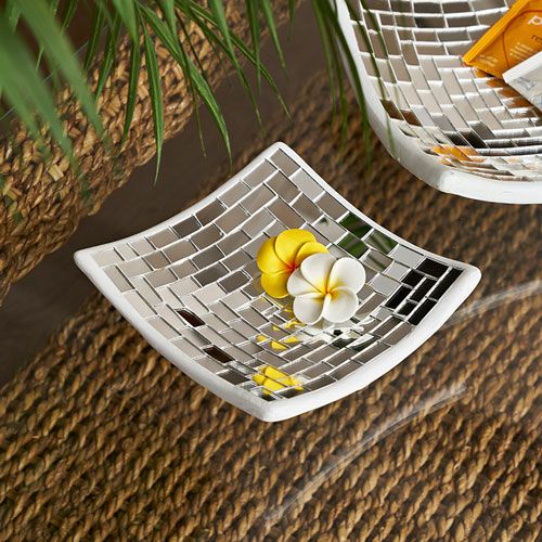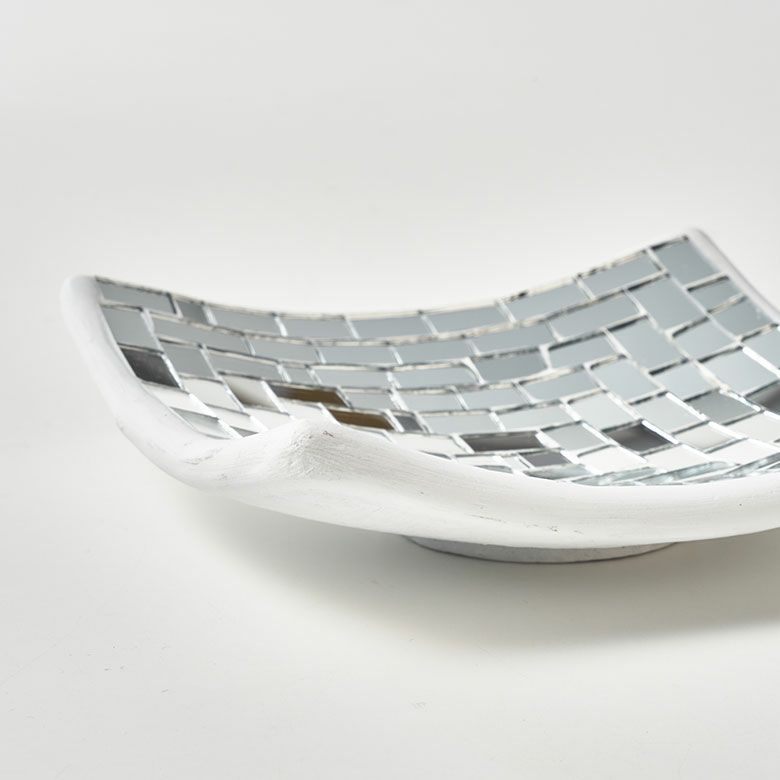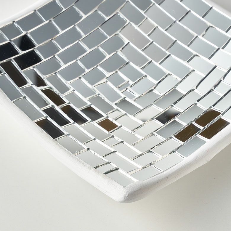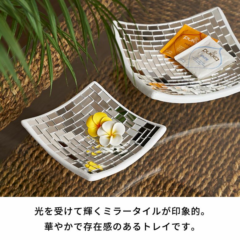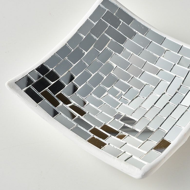 | ハンドメイドの素朴な温かみを感じるミラータイルデコレーションプレートは、色をあえて使用していないので、いろんなオブジェとの組み合わせができます。 お花などを飾ってアジアンオブジェとして飾っていただいたり、小銭や鍵、アクセサリーなどを入れていただけば、おしゃれな小物入れとしてもお使いいただけます。 四角いシンプルなデザインで、底から丸みを帯びたやわらかなカーブがお部屋でも存在感を放ちますよ。 | ||||