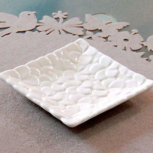 一見シンプルなスクエア型の小皿に見えますが、プルメリアが前面に型押しされた可愛い小皿。ぷくっと浮き出たプルメリアは、南国リゾートを思わせる当店でも人気のお花モチーフ。シンプルなお皿よりも可愛い雰囲気で、お部屋や玄関の飾り皿にもおすすめです♪