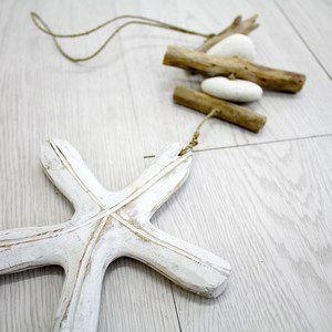 「海を感じる」インテリアにマストなヒトデなどのモチーフが、流木やホワイトストーンと一緒に繋げてナチュラルで可愛いオーナメントになりました。