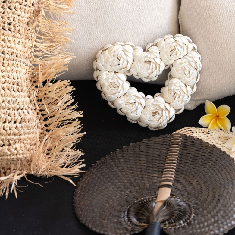 ラフィアのアイテムや、プルメリアの造花で南国ムードたっぷり。