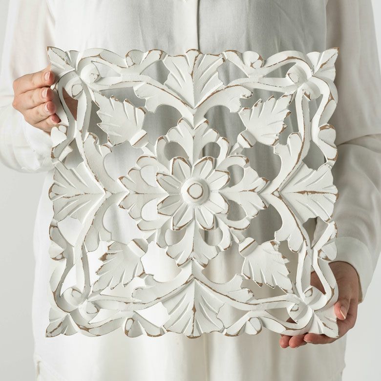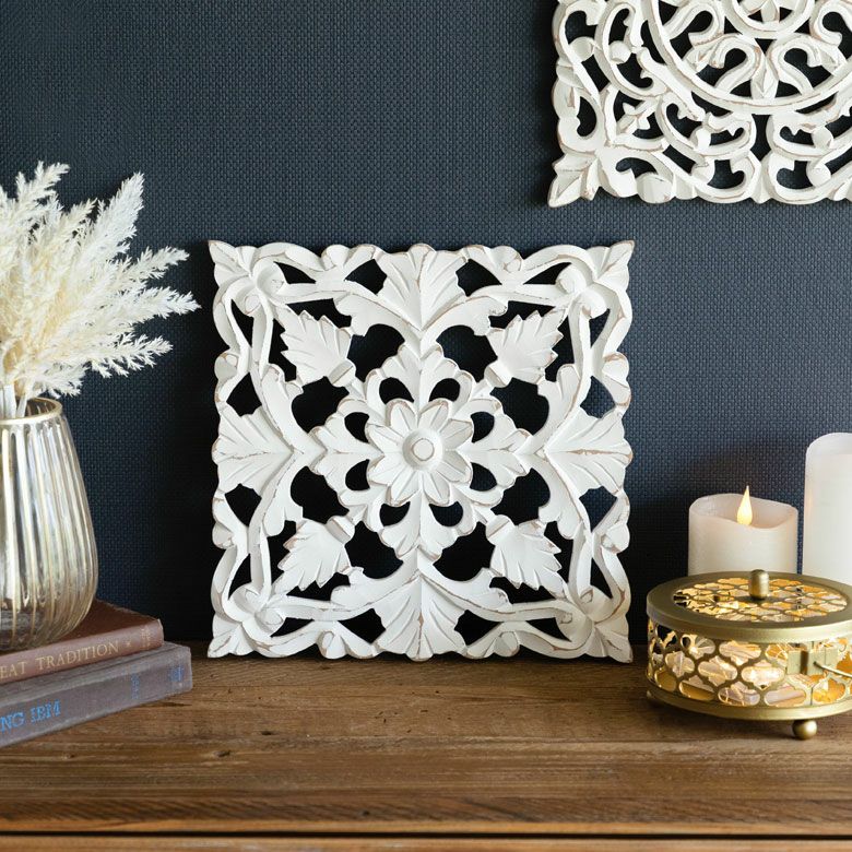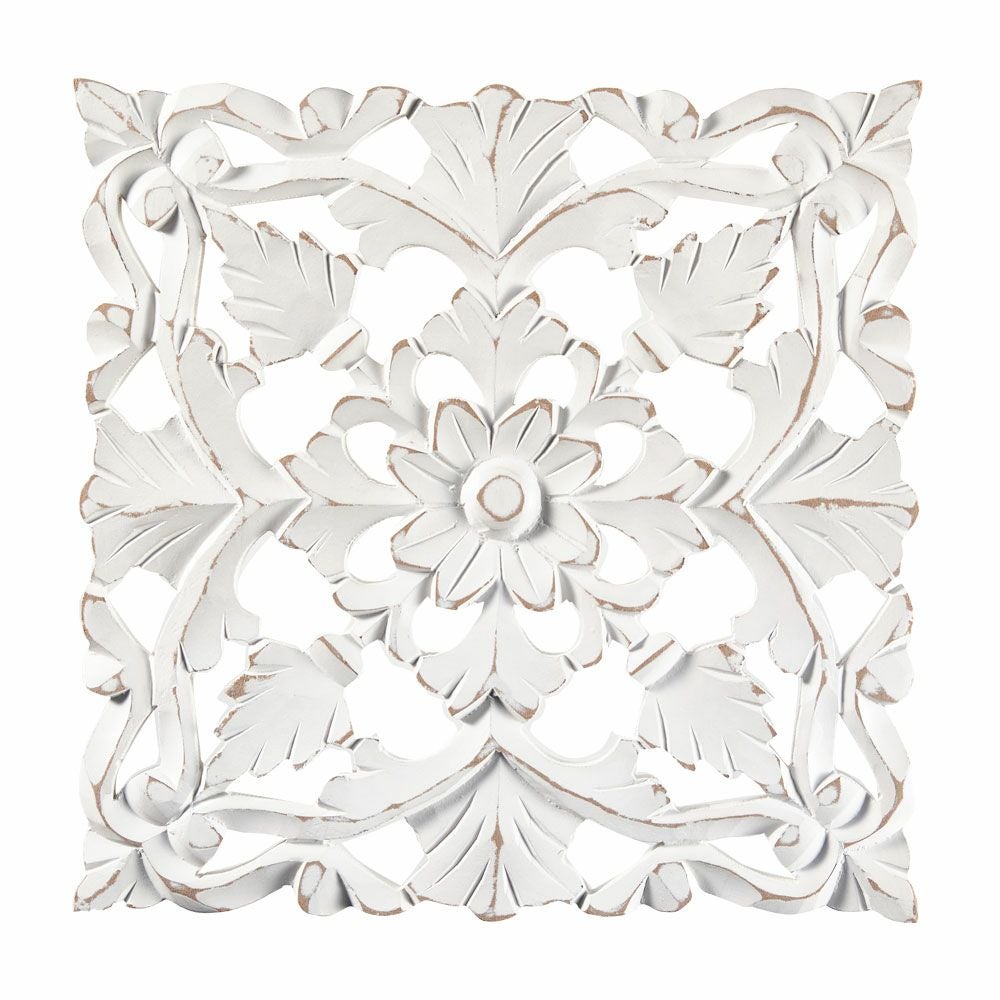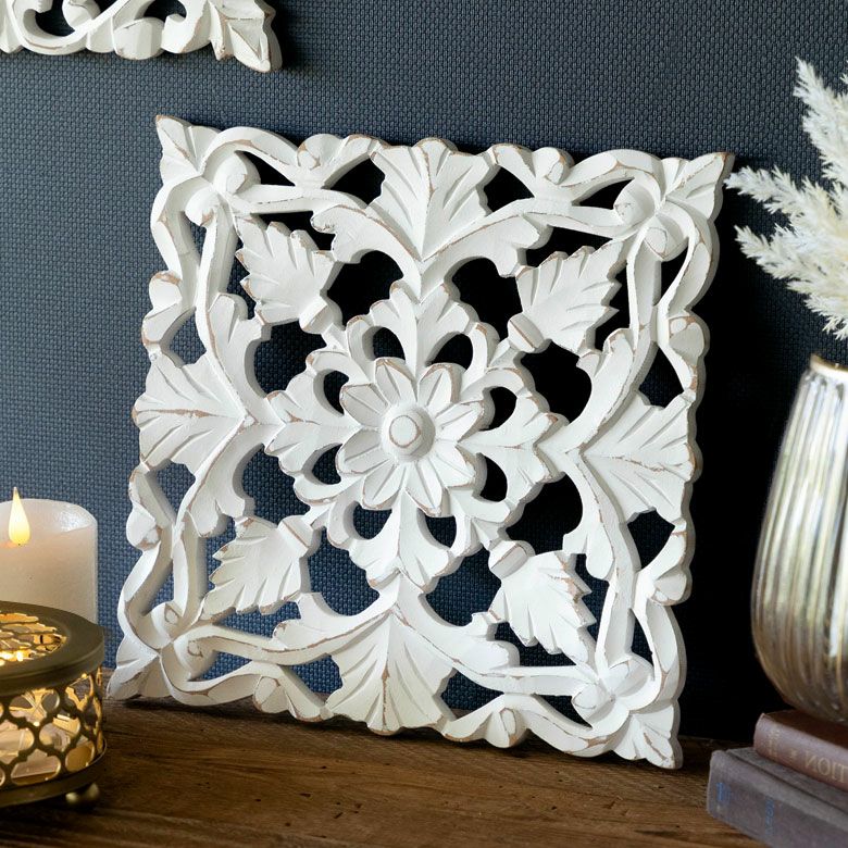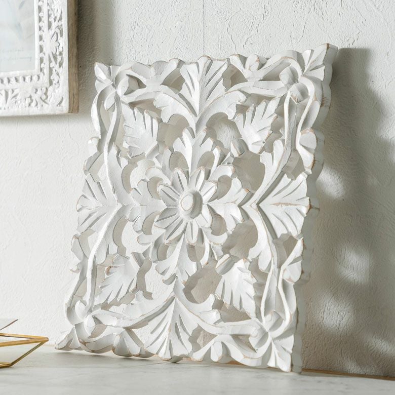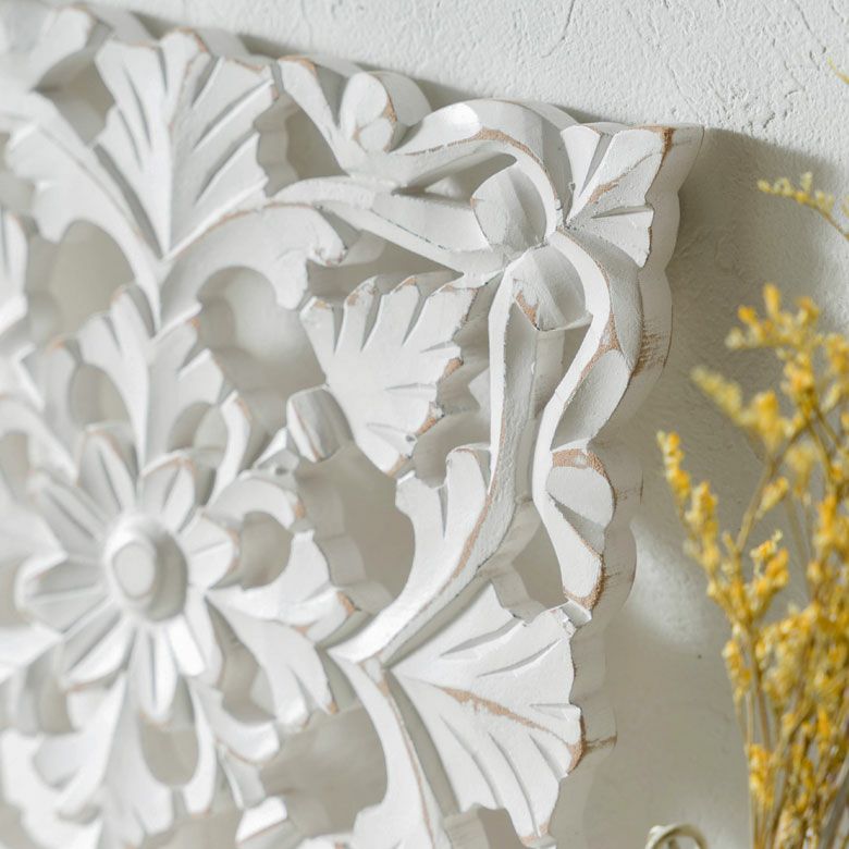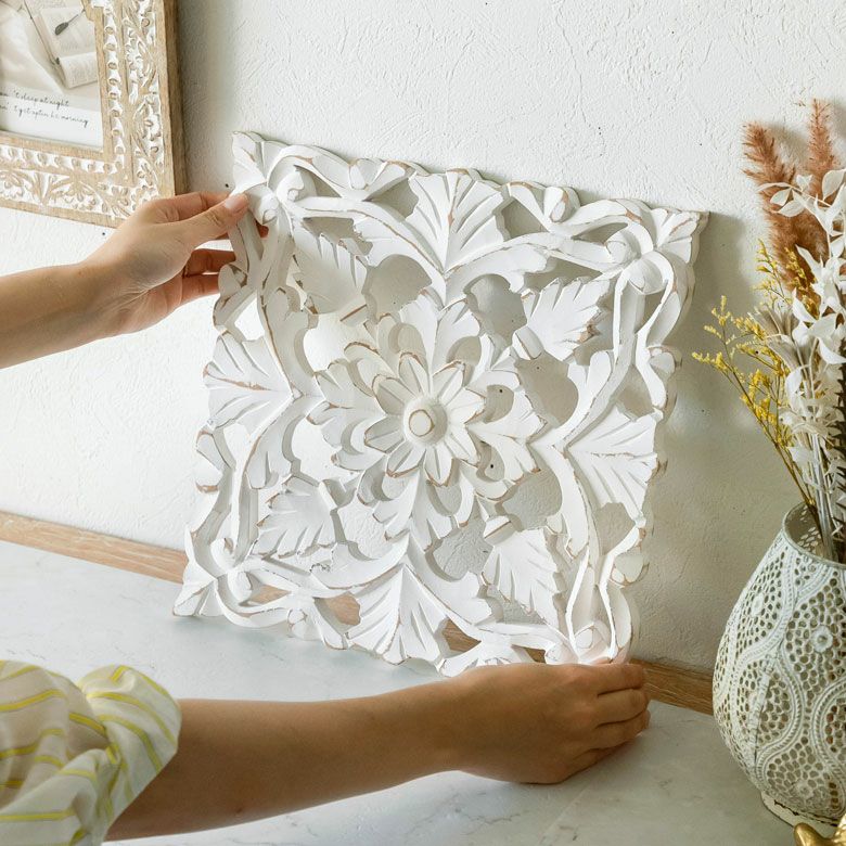 リゾート ホワイトインテリア パネル オブジェ 立て掛け 木彫り レリーフ 壁掛け アカンサス 白 ホワイト インド製 正方形 約 W 30 × D 30 × H 1.5 cm ウッドカービング アートパネル 木彫刻 壁飾り アジアンレリーフ ウォールデコレーション おしゃれ バリ島 バリ雑貨 北欧 アジアン 雑貨 アジアン雑貨 韓国インテリア [34557]