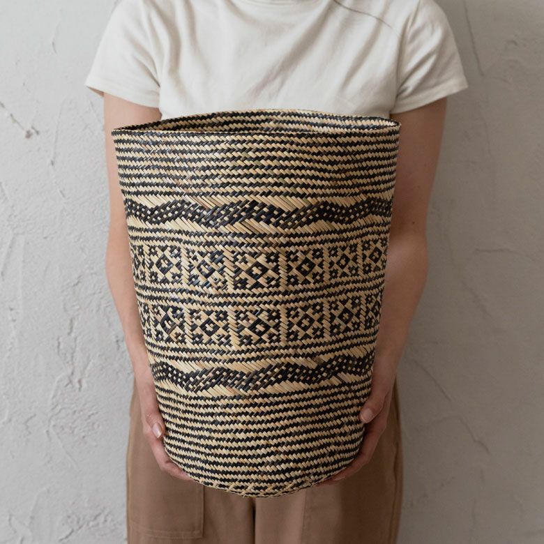 トライバルな柄と細かい模様が美しいラタン製のラタン製バスケット。