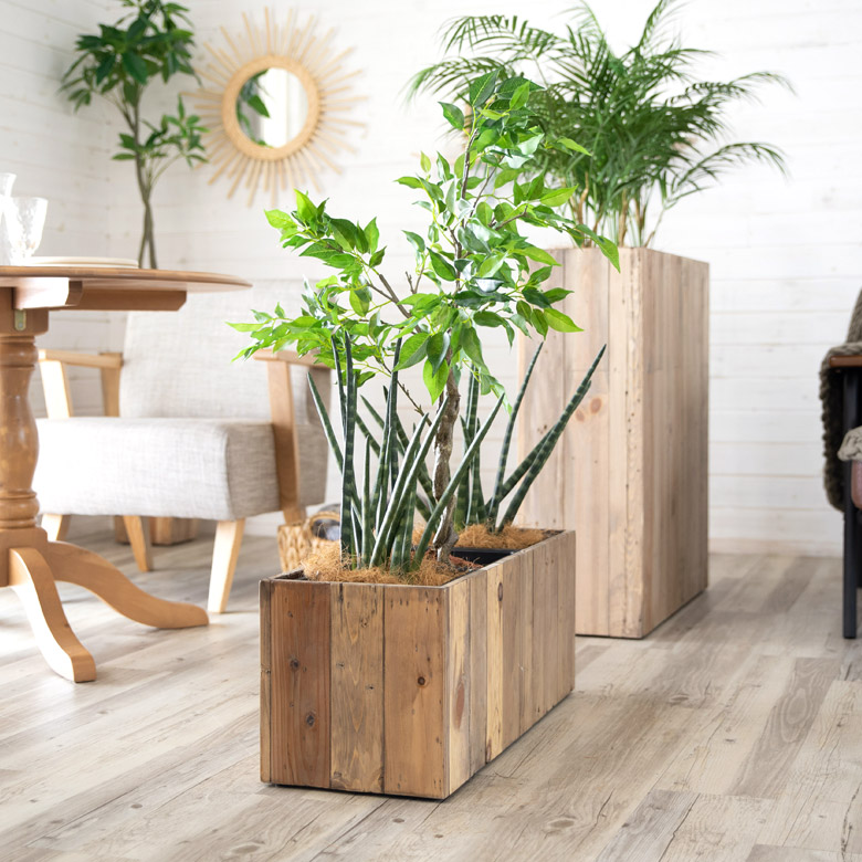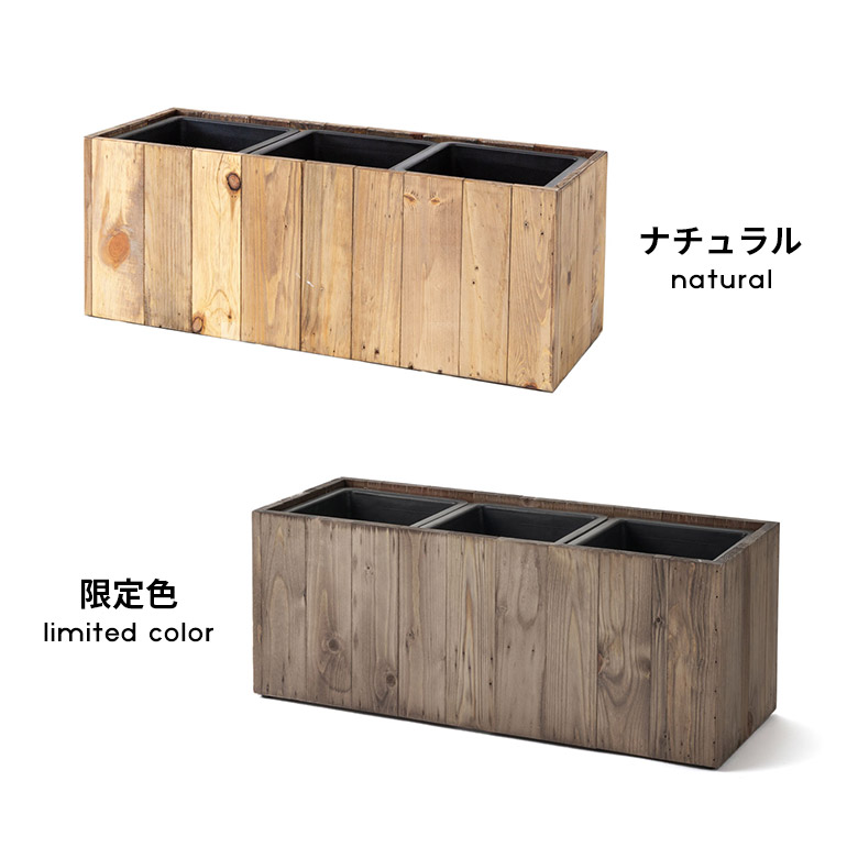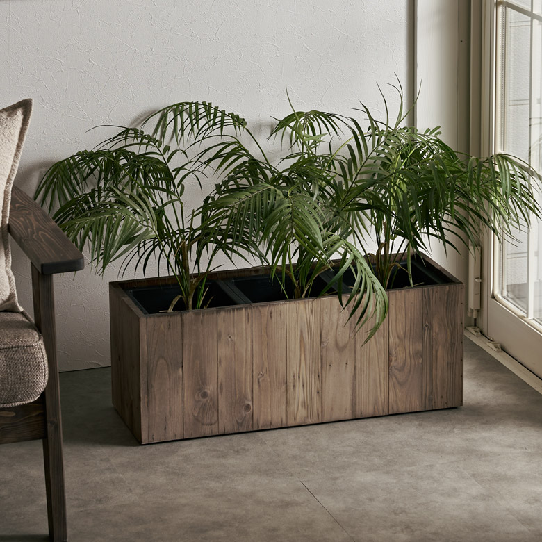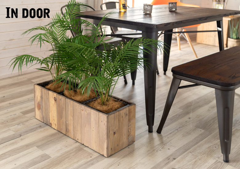 ・サスティナブル:リサイクルウッドで作られたプランターは、一点ものの風合いが魅力