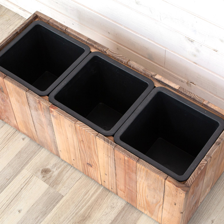 ・リサイクルウッドで作られたトリプルプランターカバーは、幅66.5cm×奥行24.5cm×高さ26cmのサイズ