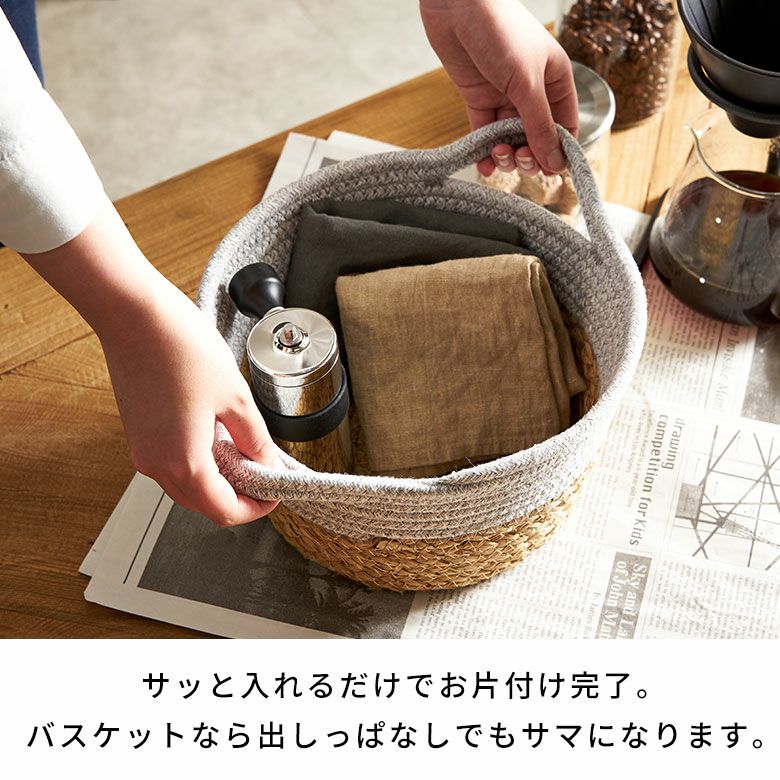 何でもサッと入れるだけで片付けできるのが、バスケットのイイところ。