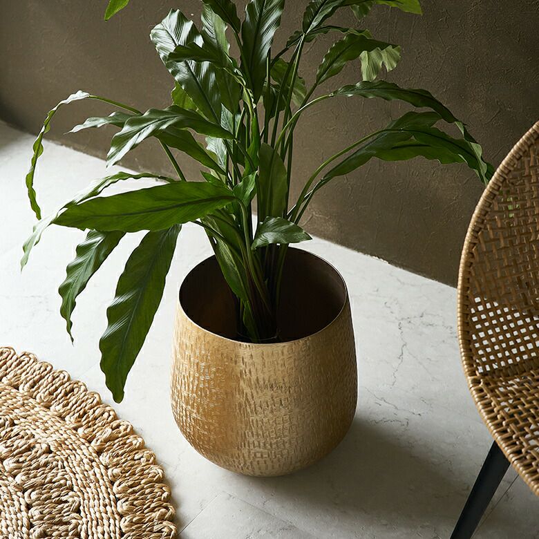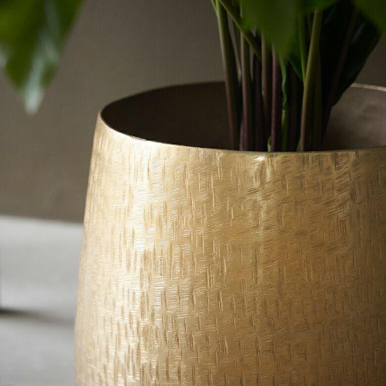 ぽってりとしたシルエットと素材感が印象的な、アルミニウム製のプランターポット。